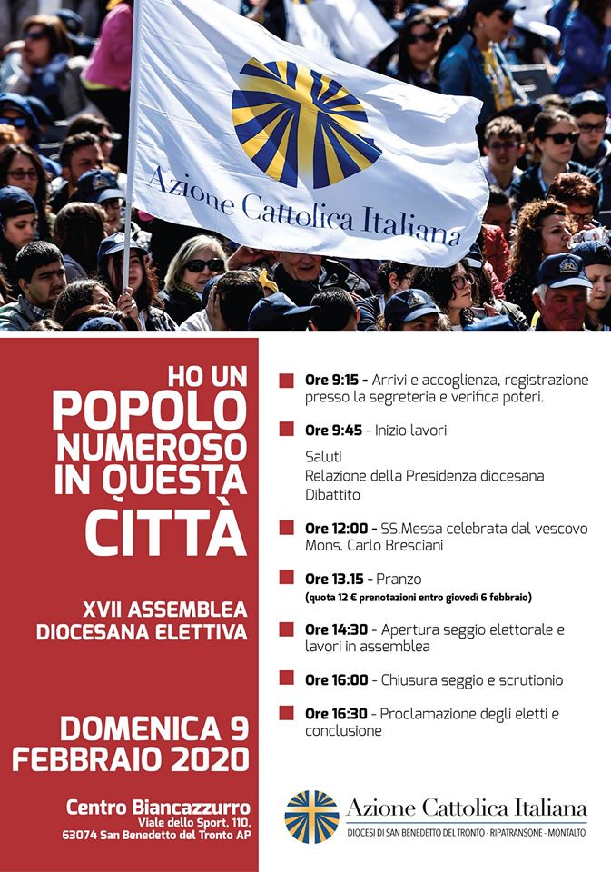 Domenica 9 febbraio, dalle ore 9.30, tutti i delegati delle parrocchie si ritroveranno invece presso il Centro Biancazzurro Sociale di San Benedetto del Tronto, per la XVII Assemblea elettiva che rinnoverà il consiglio diocesano di Azione Cattolica.