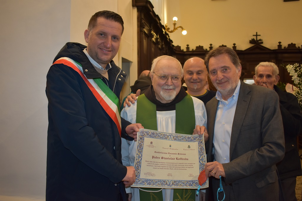 Commosso Padre Loffreda, ha ringraziato tutti dopo aver ricevuto una pergamena riportante le seguenti motivazioni: “illustre figlio della terra marchigiana, il riconoscimento per la capacità di aver coniugato una scelta di vita semplice e modesta in ossequio delle regole francescane con la vivacità intellettuale e l’alto livello raggiunto nel campo dell’archeologia biblica, con importanti scoperte nei luoghi della Terra Santa, culla del Cristianesimo”.