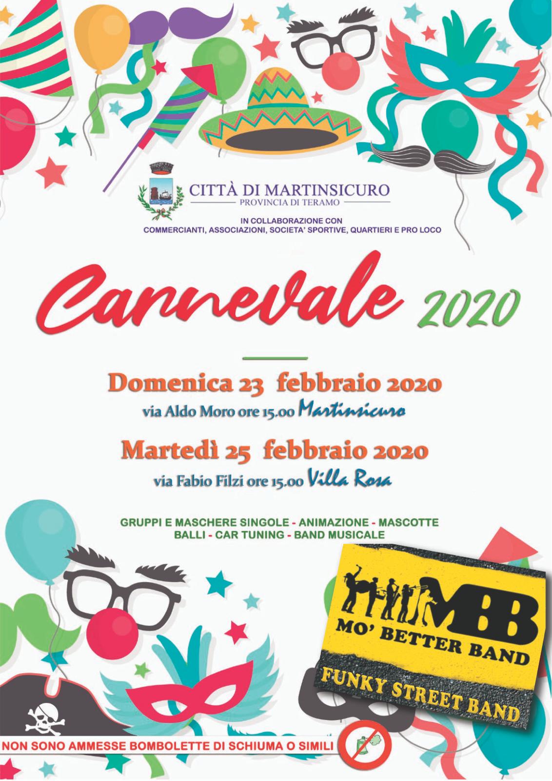 MARTINSICURO – L’amministrazione Comunale, in collaborazione con i commercianti, le associazioni, le società sportive, i quartieri e le pro loco organizza il “Carnevale 2020”. Come da tradizione saranno due gli appuntamenti: domenica 23 febbraio, con inizio alle ore 15:00, in via Aldo Moro a Martinsicuro: martedì 25 febbraio, sempre con inizio alle ore 15:00, in via Fabio Filzi a Villa Rosa.