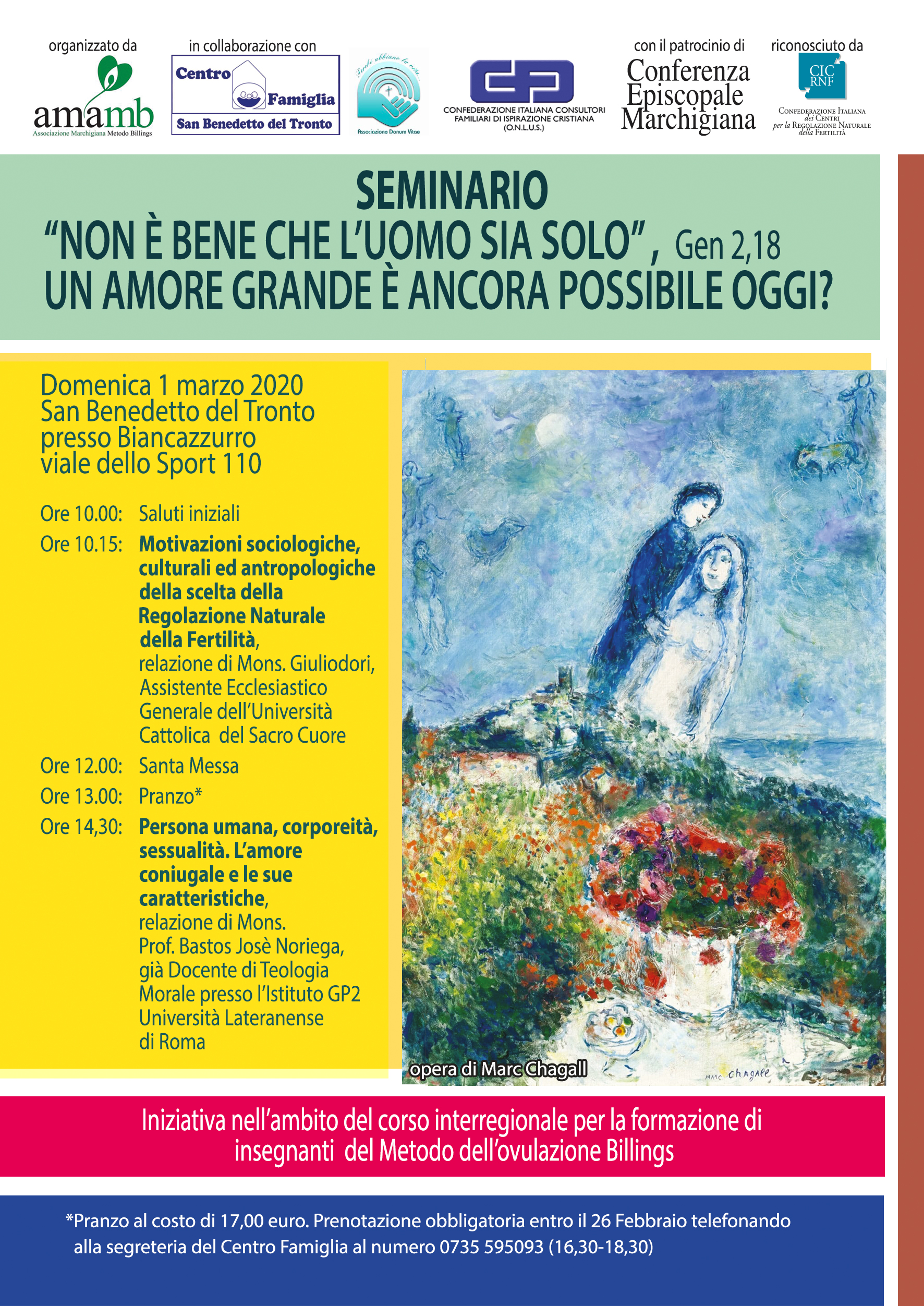 DIOCESI – ‘Non è bene che l’uomo sia solo’ Gen.2,18 – Un amore grande è ancora possibile oggi? si intitola così il seminario che si terrà domenica 1 marzo presso il Centro Biancazzurro di San Benedetto del Tronto. I relatori, Mons. Giuliodori, Assistente Generale Ecclesiastico dell’Università Cattolica del Sacro Cuore e il prof. Josè Noriega, già docente Di Teologia Morale presso l’Istituto Giovanni Paolo II università Lateranense di Roma, affronteranno le seguenti tematiche: “Le motivazioni antropologiche, sociologiche e culturali della scelta della RegolazioneNaturale della Fertilità” (ore 10,00) e “Persona umana, corporeità, sessualità: l’amore coniugale e le sue caratteristiche” (ore 14,30). Gli argomenti sono della massima attualità nella nostra società individualista e priva della vera dimensione dell’amore. Per questo invitiamo a dare massima diffusione e a partecipare concretamente.