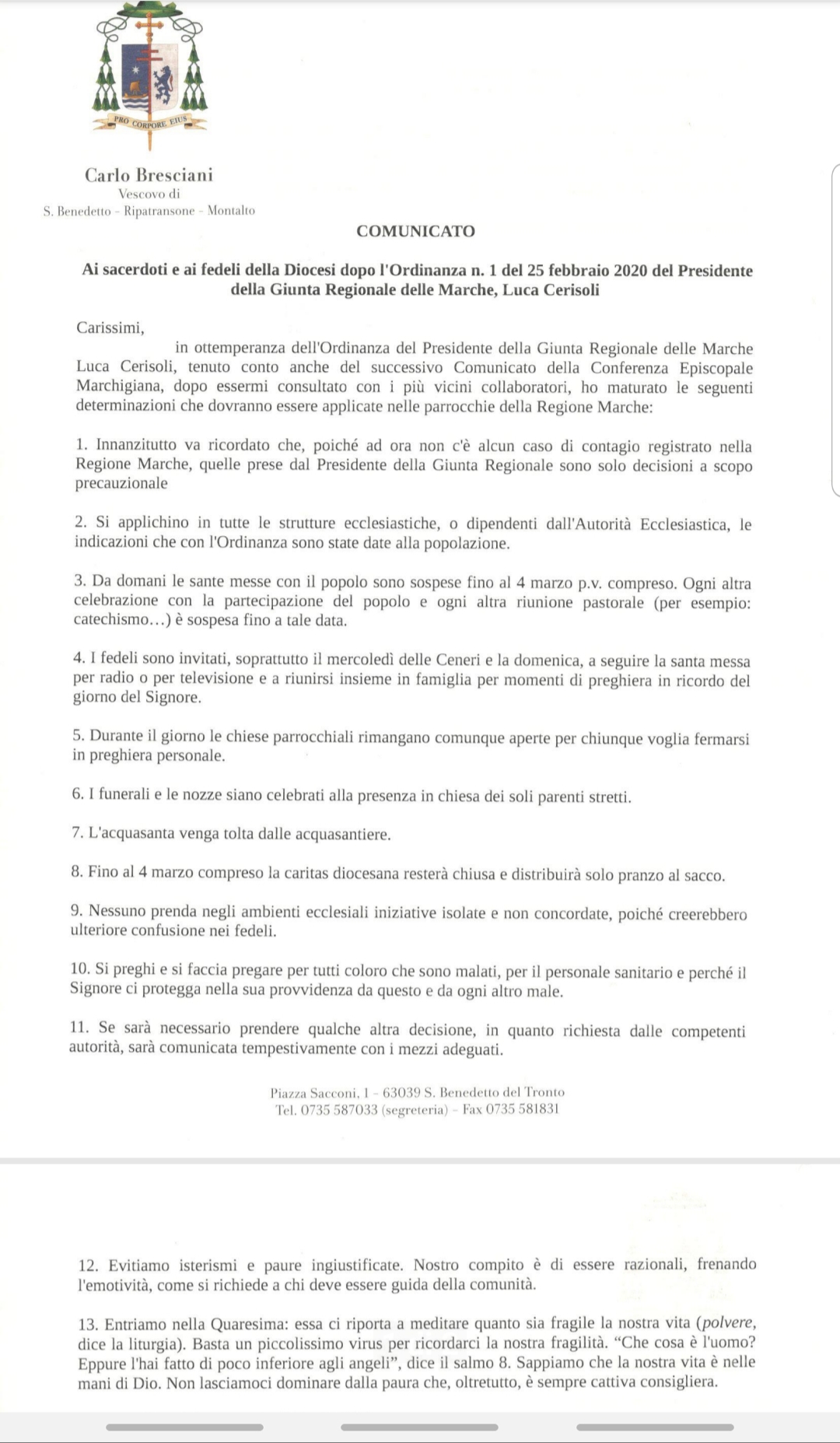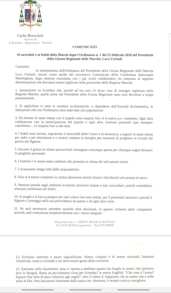 MARCHE – I Vescovi delle Marche facendo seguito all’ordinanza n.1 del 25 febbraio 2020 del Presidente della Regione Marche, circa le misure urgenti in materia di contenimento e gestione dell’emergenza epidemiologica da COVID-2019, adottano le seguenti disposizioni per le chiese che sono nelle Marche: