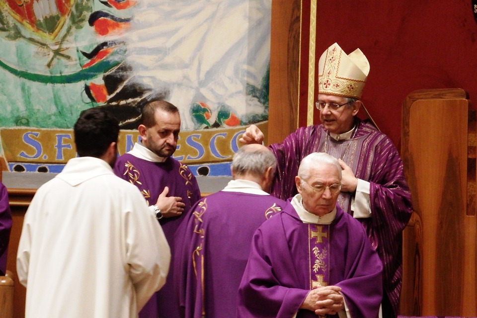 Il momento principale della celebrazione, ossia l’imposizione delle Sacre Ceneri, si è ovviamente svolto in forma “ridottissima”. Dopo la benedizione delle ceneri da parte del vescovo, quest’ultimo è stato il primo a riceverle, per mano del vicario generale don Patrizio Spina, parroco della cattedrale. Poi lo stesso vescovo le ha ai sacerdoti, ai diaconi ed alle altre persone servivano messa, concelebrata (oltre che da don Spina, anche da monsignor Romualdo Scarponi e da don Luciano Paci).