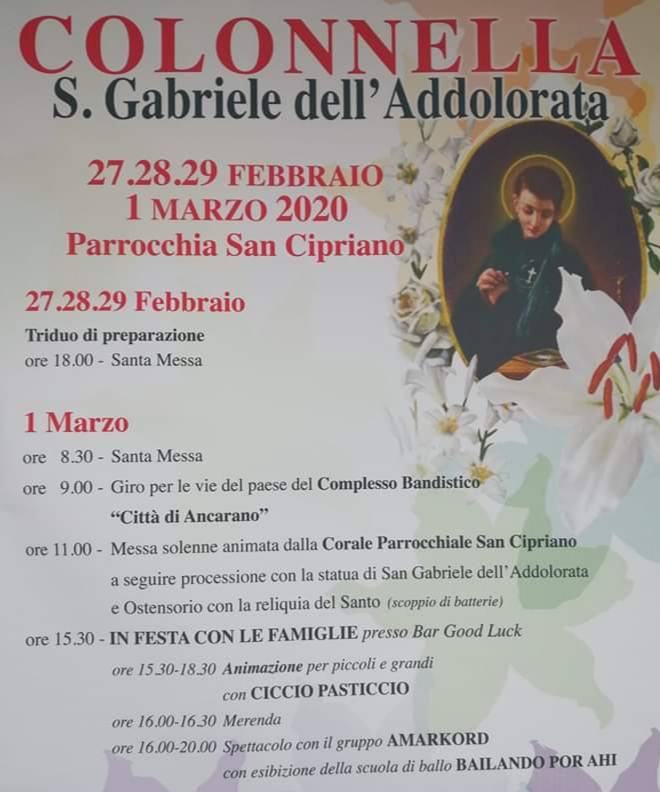 Già nei giorni precedenti i fedeli Colonnellesi si sono riuniti alle ore 18:00 per un triduo di preparazione alla festa: durante la Messa feriale, il parroco, don Dino Straccia, ha ripercorso la vita del Santo, soffermandosi su alcuni parlticolari: “Gabriele amava la vita: di famiglia benestante, andava in giro con abiti che oggi definiremmo griffati, amava ballare e divertirsi, stava sempre in compagnia degli amici ed amava scherzare. Chissà in quanti volti delle nostre comunità potremmo rintracciare la voglia di vivere e la gioia dell’amicizia che erano di questo giovane! È proprio questa sua vicinanza a noi, questo suo essere come tanti giovani del nostro tempo, che fanno di San Gabriele, al secolo Francesco Possenti, uno dei santi più amati dagli abruzzesi e soprattutto dai giovani. “