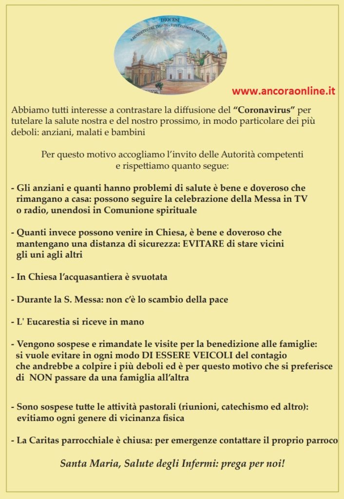 non solo la nostra Nazione, ma tutto il mondo, sta vivendo un periodo di grande difficoltà e sofferenza a causa di questo coronavirus e del suo modo subdolo d i diffondersi velocemente e contagiare molte persone. Ciò causa anche molta incertezza e necessità di prendere provvedimenti a tutela della salute dei cittadini . Alcune indicazioni sono già state date nel Comunicato n. 3 del 3 marzo che restano in vigore. Mi ero riservato di valutare in base all’evolversi della situazione circa le Sante Messe festive. Ora il Governo ha emesso un Decreto legge i l 4 marzo 2020 che ha validità fino al 3 aprile p.v.