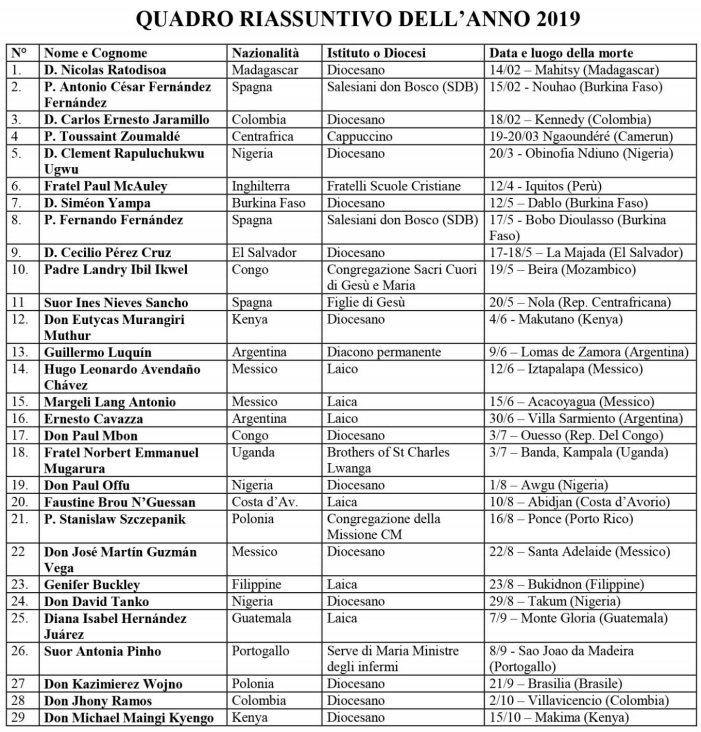 È in questo contesto che nell’anno 2019, sono stati uccisi nel mondo 29 missionari: 18 sacerdoti, 1 diacono permanente, 2 religiosi non sacerdoti, 2 suore, 6 laici. Lo slogan della Giornata è: “Innamorati e vivi”, slogan che oggi più che mai, si percepisce come fondamentale e questo elenco è fatto di persone battezzate impegnate nella vita della Chiesa e morti in modo violento.