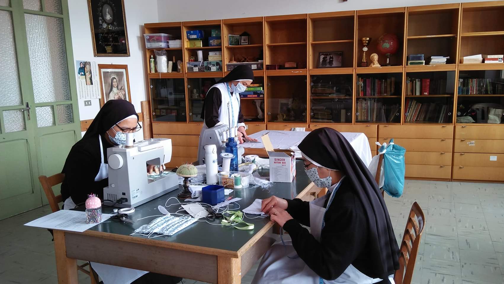 Ci siamo chieste che cosa potessimo fare di concreto nel nostro piccolo, dovendo stare chiuse in convento. Allora ci è venuto in mente che il nostro tempo e la nostra fatica potessero essere spesi per realizzare delle mascherine da donare alle persone che ce ne avessero fatto richiesta. In questo modo il tempo vola e la fatica ci sembra più leggera perché ha uno scopo di Carità.