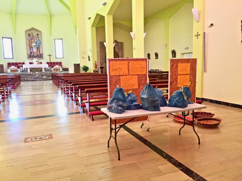 SAN BENEDETTO DEL TRONTO – “Non sappia la tua sinistra ciò che fa la tua destra”. La celebre frase del Vangelo secondo Matteo trova una bella applicazione pratica anche in questi tristi tempi di Coronavirus. Ciò avviene presso la parrocchia della Sacra Famiglia, dov’è stato attivato un servizio di consegna anonima di pacchi-cibo, a cui chi ha davvero bisogno può accedere senza alcuna formalità, semplicemente entrando nella chiesa del quartiere Ragnola. Lì (dalle ore 9 alle 19) su un tavolo vengono riposti i contenitori con i generi di prima necessità.  Anche chi vuol donare degli alimentari può farlo (sempre in forma anonima) lasciando le derrate sempre all’interno delle sacre mura. Successivamente, saranno smistate dal personale parrocchiale dei vari pacchi.