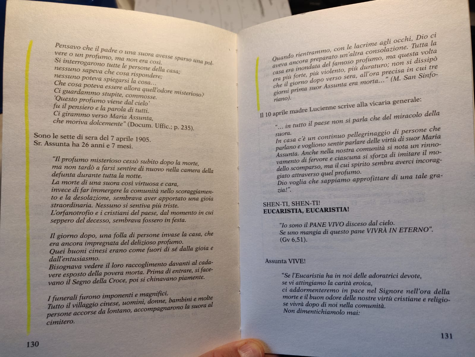 Ma perché questa religiosa è legata ai fiori? Presto detto. Come si può leggere approfonditamente nelle pagine del libro sulle vicende di Maria Assunta (si vedano le foto disponibili in coda all’articolo) il legame deriva da un prodigio, avvenuto quando la suora era in punto di morte. Malata di tifo, giace sul letto per lunghi giorni e, sentendo vicina la fine,  mormora in cinese: “ShenTi, Shen-Ti!” Ossia: Eucaristia, Eucaristia!