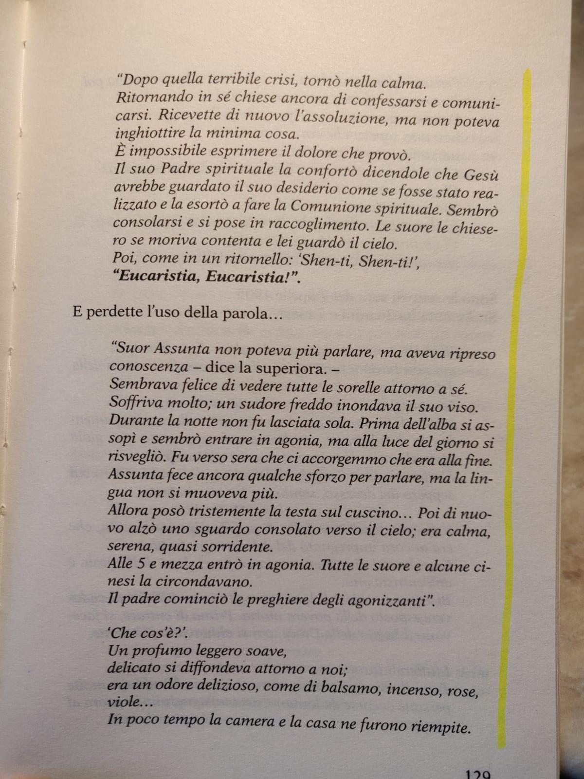 Non riuscendo ad inghiottire, tanto la malattia l’aveva debilitata, il confessore l’esorta ad esprimere interiormente a Cristo stesso il desiderio di riceverlo: che faccia, cioè, la Comunione spirituale. Così fa e si avvia verso l’agonia con anima rinfrancata. Venti minuti prima di morire un odore misterioso, tra violette e incenso, inondò la stanza della suora morente. Questo prodigio si ripeté nelle strade dove fu portato il suo feretro, nelle stanza e dove aveva abitato. Era un profumo indefinibile, tra l’olezzo delle violette e quello dell’incenso, ma «nessuno dei due», diranno i testimoni. Il fatto colpisce molto anche i cinesi che, già da subito, iniziano a gridare al miracolo, chiamando Suor Maria Assunta la “Santa dei Profumi”.