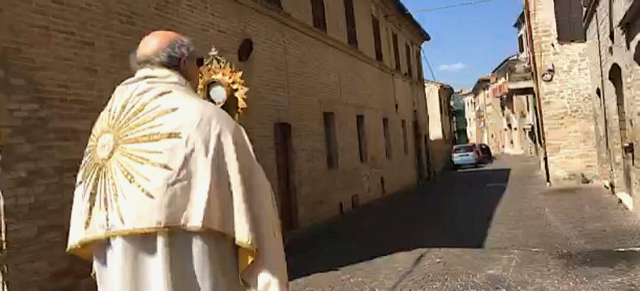 Prima della messa Pasquale, con la sua consueta delicatezza e umanità, il Priore ha voluto percorrere, con in mano l’Ostensorio che mostrava il Santissimo Sacramento, quelle vie vuote del centro storico del paese (questa volta Via Castello, Via Sant’Antonio ecc.) fino ad arrivare nel piazzale antistante gli ingressi dell’Istituto Mancinelli e del Centro Anziani! Qui, rigorosamente dall’esterno, ha impartito la benedizione a tutti gli ospiti. In questo percorso è stato ovunque accompagnato dal sindaco!