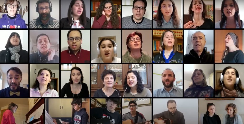 Al contempo, però, di giorno in giorno cresceva anche il desiderio di fare comunque qualcosa per sentirci comunità ma che non fosse solo per noi, qualcosa di affine al servizio che normalmente svolgiamo in parrocchia. Ci siamo chiesti: cosa può fare un coro parrocchiale durante un’emergenza come quella che stiamo vivendo? Già da alcune settimane in rete circolavano dei video realizzati in questa modalità, alcuni li abbiamo condivisi anche all’interno della chat del coro: un primo video, un secondo… finché qualcuno un giorno ha esordito dicendo: “perché non facciamo anche noi una cosa simile?” seguito da un consenso generale! Era questa la risposta alla nostra domanda, la più scontata ma anche la più vera: possiamo comunque cantare, continuare a cantare e a far cantare!