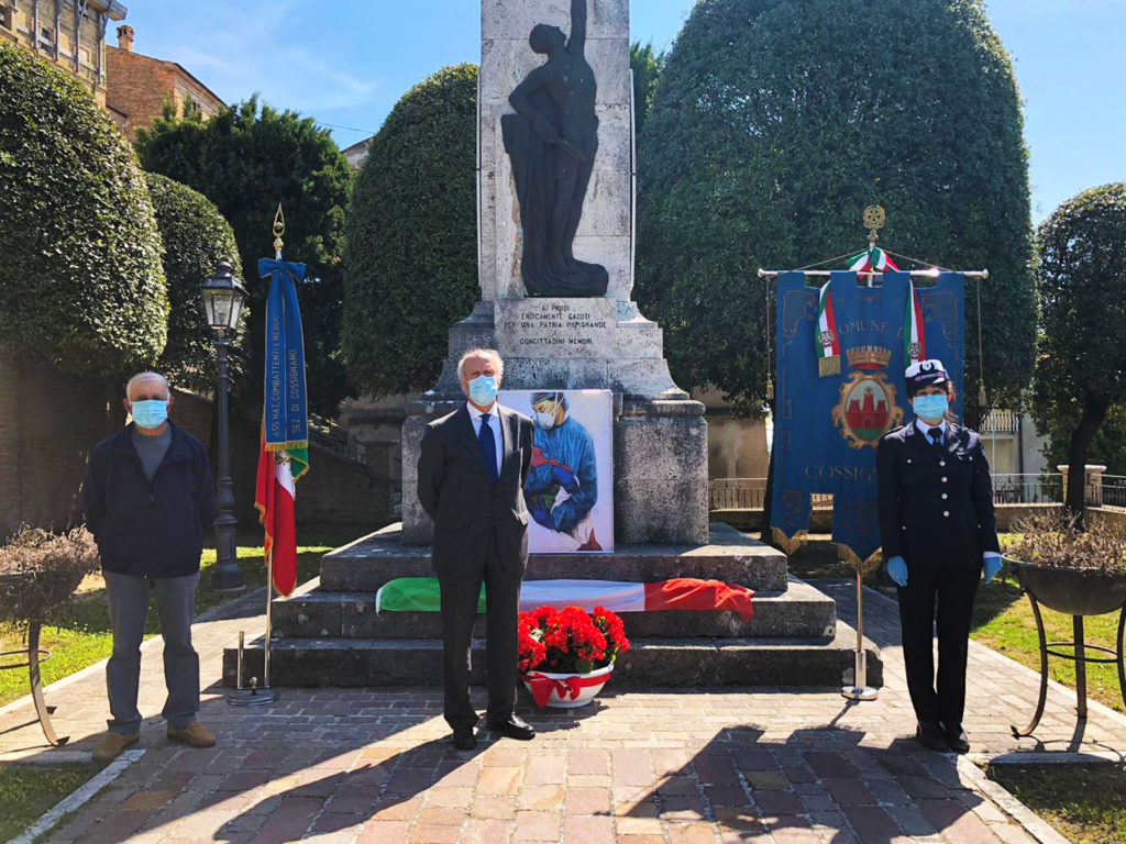 COSSIGNANO – In occasione del 75° anniversario della Liberazione il Sindaco Giancarlo Vesperini, con un rappresentante dell’Associazione dei Combattenti e Reduci e il Responsabile della Polizia Locale, nel rispetto delle regole imposte dall’emergenza covid-19, ha deposto dei fiori al Monumento dei Caduti e ha espresso il seguente pensiero: