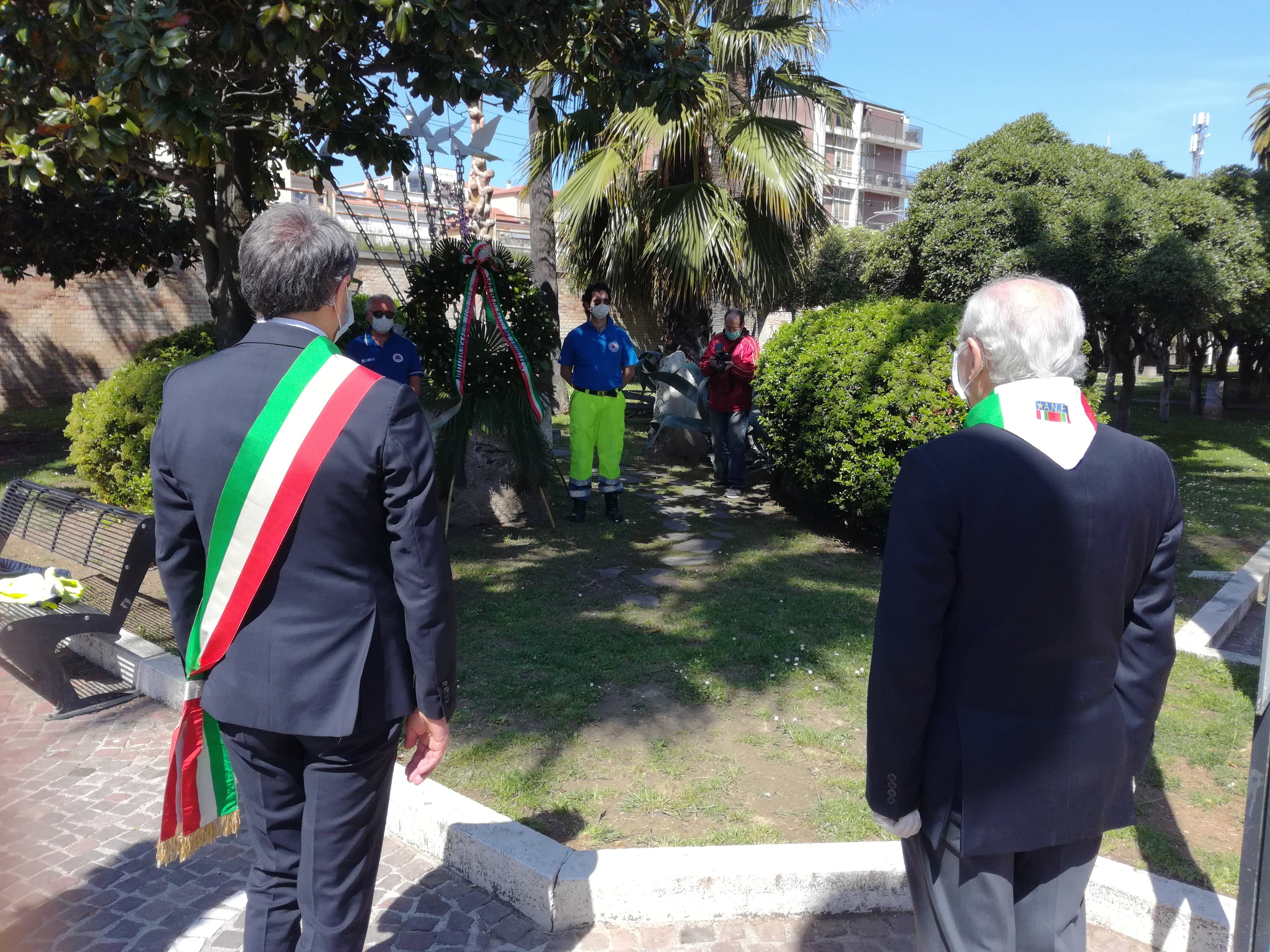 SAN BENEDETTO DEL TRONTO – Il 25 aprile, festa della Liberazione, il sindaco Pasqualino Piunti e il presidente della locale sezione dell’ANPI Antonio Bruni, in rappresentanza delle associazioni combattentistiche e d’arma, hanno presenziato alla cerimonia di deposizione di una corona di alloro dinanzi al monumento “ai Caduti della Libertà” di viale Moretti che ricorda appunto tutti coloro che hanno dato la vita per restituire libertà e democrazia all’Italia. Hanno deposto la corona due volontari del Gruppo comunale di Protezione civile. Si è trattato di una cerimonia breve, silenziosa, senza la presenza di autorità e cittadini, come disposto dal Governo per questo periodo.