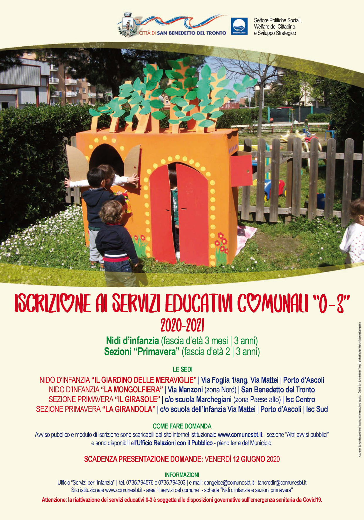 SAN BENEDETTO DEL TRONTO – Fino al 12 giugno 2020 sono aperte le iscrizioni di bambini dai 3 mesi (compiuti a settembre 2020) ai 36 mesi ai quattro servizi educativi comunali: si tratta dei nidi d’infanzia “La Mongolfiera” di v. Manzoni e “Il Giardino delle Meraviglie” di via Foglia – via Mattei a Porto D’Ascoli, e delle sezioni Primavera “La Girandola” di via Velino (scuola dell’infanzia di Mattei) e “Il Girasole” di via Impastato (scuola “Marchegiani” del Paese alto). L’iscrizione alle sezioni “Primavera” è riservata ai bambini che compiono 24 mesi di vita entro il 31 dicembre 2020 .
