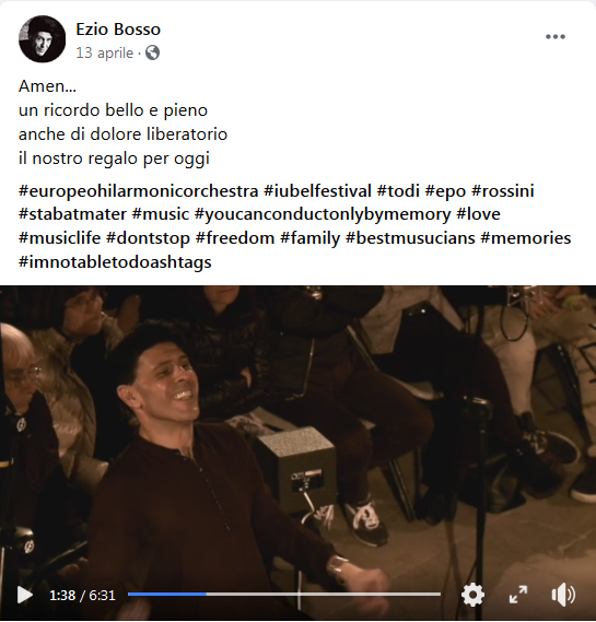Il video postato su Facebook porta la data del 2 maggio, due giorni prima del concerto, quando si è tenuta la prima delle prove aperte al pubblico. Un’esecuzione vibrante e intensa, carica di energia. Ma ancora un “work in progress”. Perché – come aveva spiegato lo stesso Bosso in un’intervista televisiva di un mese fa – la musica, con le sue note e i suoi accordi, è come la vita, un continuo percorso creativo e interpretativo, che coinvolge non solo i musicisti, ma anche quanti partecipano dalla sala “suonando con il loro silenzio”.