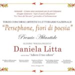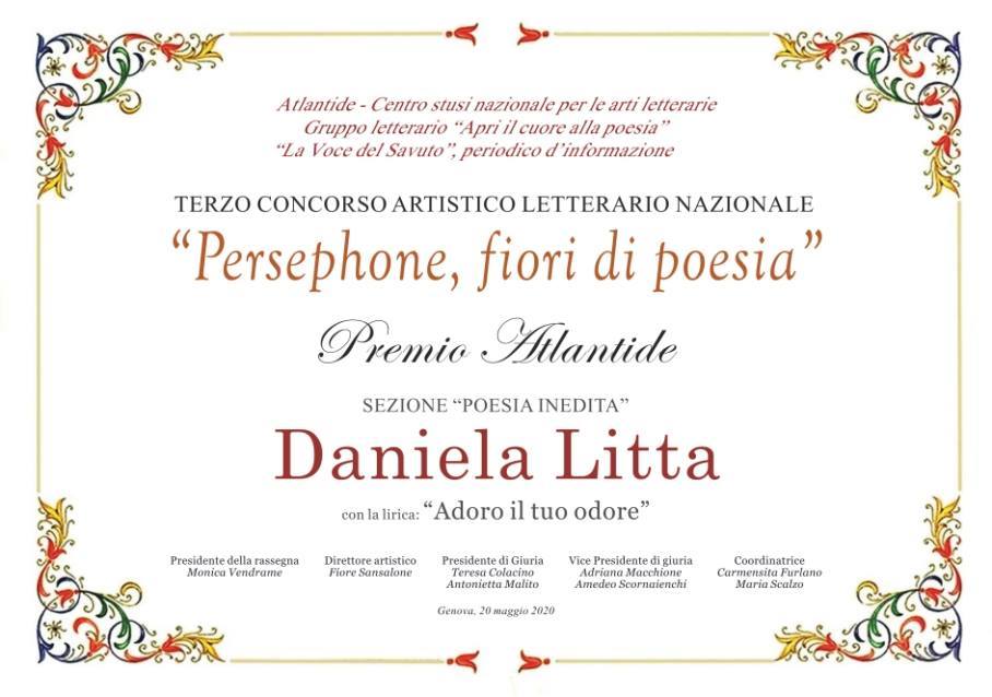 Daniela Litta, con “Adoro il tuo odore”, si è aggiudicata il Premio letterario “Atlantide 2020”, Terzo Premio artistico letterario nazionale online “Persephone, fiori di poesia” – Omaggio alla Primavera.