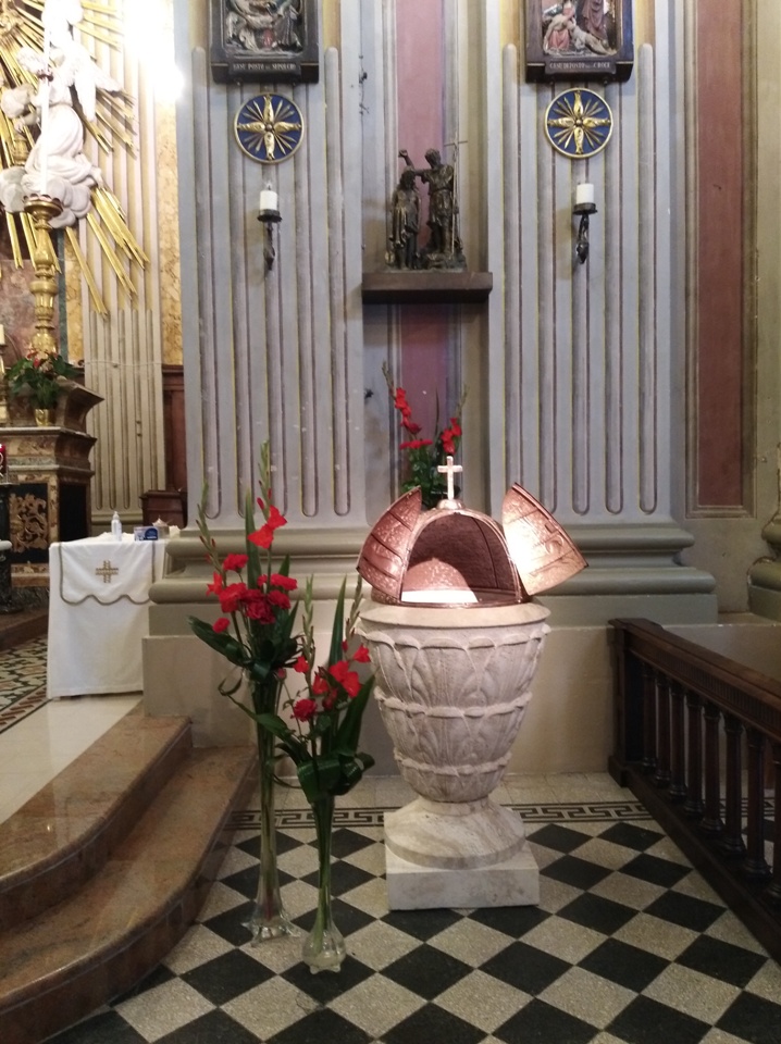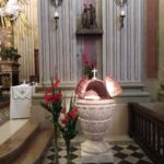 Si è quindi sistemato in una zona della chiesa che permette il suo utilizzo per le celebrazioni dei battesimi che prevalentemente si svolgono durante le Celebrazioni Eucaristiche. Con l’occasione si è pulita la sua cupola in rame, un pregevole lavoro artigianale locale, riapparsa in tutto il suo splendore insieme ad una terracotta bronzata di fine XIX secolo, che totalmente annerita da tempo, si perdeva nella sua nicchia. Dal lavoro di sistemazione ne è risultato un battistero delimitato da una piccola balaustra in legno precedentemente della cappella del Cristo Morto, uno spazio ben identificato, un luogo che anche visivamente parla della vita nuova donata dal Signore che nel battesimo ha nuovamente aperto le porte del Paradiso. Questo fonte fu offerto negli anni sessanta da una coppia di coniugi conosciuti in paese come “ i maestri Semprini”, una coppia che non aveva avuto figli e che volle lasciare alla parrocchia un fonte fisso che fosse il grembo vitale della comunità cristiana, questa testimonianza di fede può essere ben riassunta da questo testo della preghiera di benedizione del fonte, memoria dell’azione dello Spirito Santo nella chiesa, nella Pentecoste. “Manda o Padre, su queste acque lo Spirito Santo, che adombrò la Vergine Maria, perché desse alla luce il Primogenito; il tuo soffio creatore fecondi il grembo della Chiesa, sposa del Cristo, perché generi a te una nuova progenie di candidati alla patria celeste”.