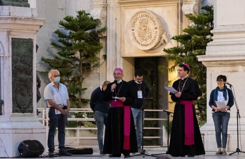Papa Francesco: Caro Monsignore, cari pellegrini virtuali, cari ragazzi e ragazze, uomini, donne, tutti voi che siete in questo momento fuori del Santuario della Madonna di Loreto, la Madre della speranza, la Madre che aiuta a guardare oltre, in questi momenti tanto difficili: abbiamo bisogno di guardare oltre con speranza. Vi sono vicino in questo pellegrinaggio virtuale e prego con voi e per voi e voi pregate per me. Abbiate coraggio! I tempi che si avvicinano, dopo questa pandemia, non saranno facili, ma col coraggio, la fede, la speranza potremo andare avanti. Coraggio! Chiedete alla Madonna questo coraggio oggi. Io sono con voi pregando.