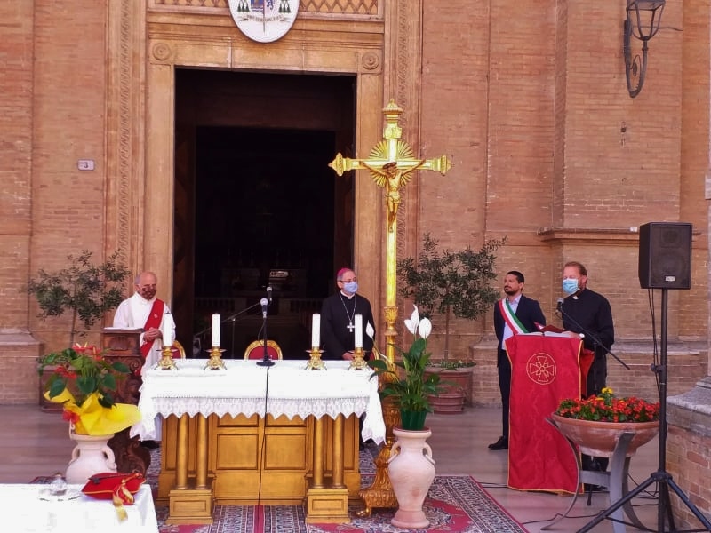 MONTALTO DELLE MARCHE – Grande entusiasmo tra gli abitanti di Montalto Marche per la festa patronale in onore di San Vito Martire. La popolazione, ha voluto ringraziare attraverso la preghiera, la protezione avuta finora dalle insidie del Coronavirus che non ha colpito gravemente il territorio, come purtroppo accaduto in altre località italiane. Oggi, 21 giugno, si è celebrata la messa presieduta dal vescovo della diocesi di San Benedetto Carlo Bresciani nella piazza adiacente al palazzo comunale e alla cattedrale di Santa Maria Assunta. La gente raccolta in silenzio, ha aspettato l’arrivo dei Castelli di Patrignone e Porchia da anni componenti del corteo della Quintana di Ascoli. Il sindaco Daniel Matricardi, la protezione civile, la polizia municipale, e i carabinieri della locale stazione, hanno consegnato simbolicamente le chiavi della città al Santo patrono.