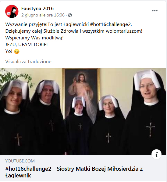 A “spaccare”, però, non sono stati i “bro” (brothers, fratelli) quanto le “sis” (sisters, sorelle). Quelle vere, con tanto di velo. Quelle del convento della Congregazione delle suore della Beata Vergine Maria della Misericordia a Łagiewniki, che sorge accanto al santuario della Divina Misericordia a Cracovia-Łagiewniki. Lo stesso convento in cui visse s. Faustina Kowalska, la religiosa polacca canonizzata nel 2000 da s. Giovanni Paolo II e venerata in tutto il mondo come l’apostola della Divina Misericordia.