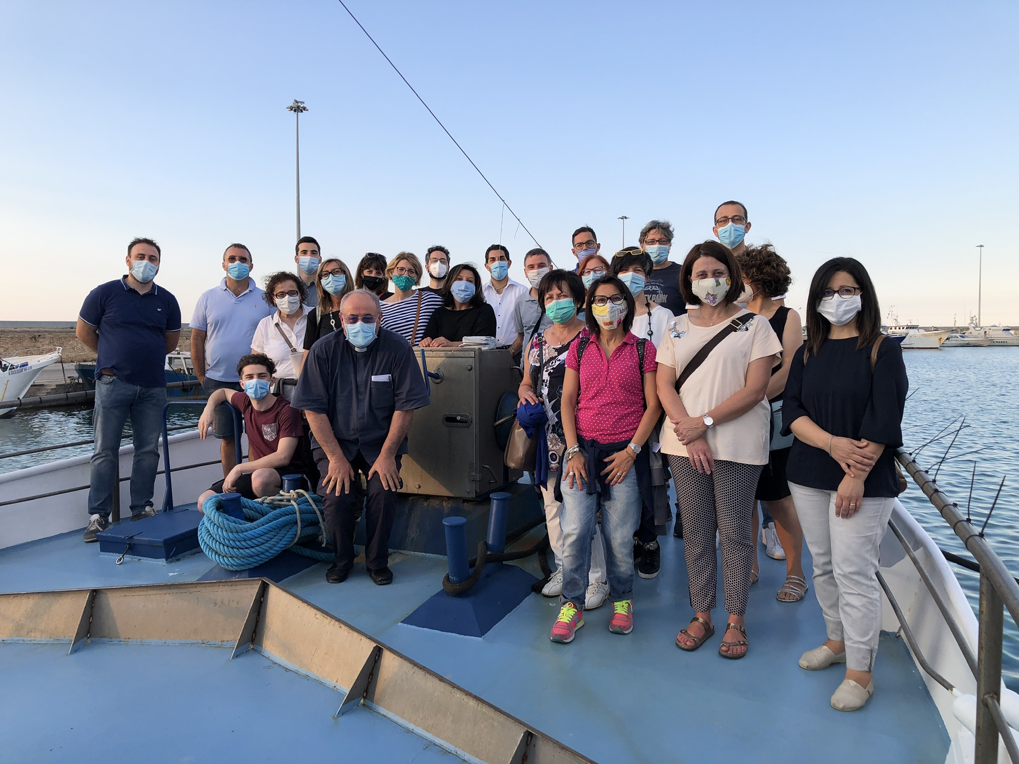 Sul peschereccio “Cristiana” don Giuseppe Giudici ha tenuto una prima meditazione, dopo aver letto il passo evangelico della chiamata dei primi discepoli: «Gesù per chiamare i suoi discepoli entra nella loro vita: loro non stavano nel tempio a pregare, ma stavano lavorando. Gesù li chiama a diventare pescatori di uomini, ovvero a trasformare la loro vita in servizio, ma tutto – ed è questa la cosa interessante – a partire dalla loro vita di pescatori di pesci: non da una cosa astratta, da un’ideale o, peggio ancora, da un’ideologia, ma dalla vita concreta. Noi ci troviamo sulla prua della barca, che non è un luogo di lavoro, ma, quando il tempo lo permette, di contemplazione dell’alba, dei tramonti. Quando invece ci sono le tempeste è un luogo dove non si può stare. È un po’ la metafora della nostra vita che è fatta di gioie e di dolori: siamo chiamati a stare dentro a ogni circostanza. Non è che quando le cose vanno male diciamo: “Allora lasciamo perdere!”. I dolori, come le gioie, fanno parte della vita e vanno accolti con la fede che non è capire tutto, ma accogliere tutto, perché dietro a quello che ci accade Dio vuole dirci qualcosa».