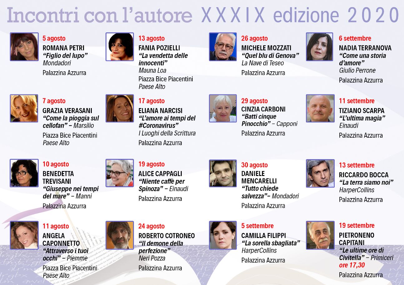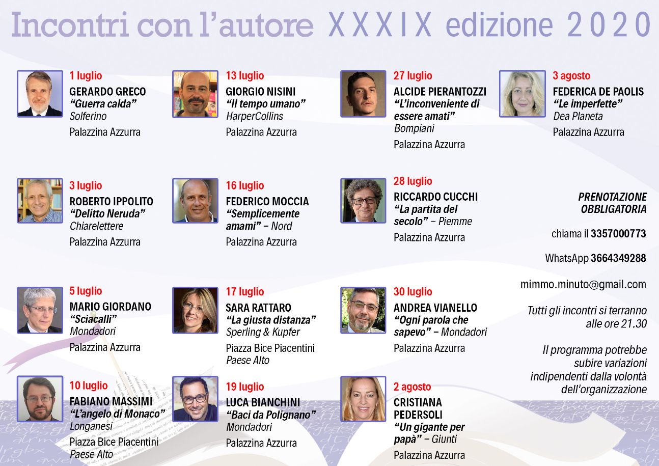 Da luglio a settembre, al momento sono previsti 29 rendez-vous ma nella manica del patron Minuto ci sono almeno altri due assi ancora coperti. Una serata ad hoc (ancora da calendarizzare) sarà dedicata al vincitore del Premio Strega 2020, il cui nome si conoscerà il 2 luglio. Intanto, gli Incontri partono il 1 luglio, in Palazzina Azzurra, col giornalista Gerardo Greco che presenta “Guerra Calda”. Il cartellone completo è consultabile grazie alle foto esplicative disponibili alla fine dell’articolo.