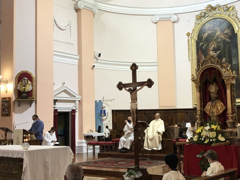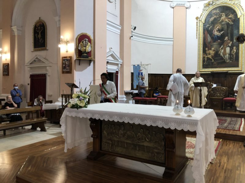 Al termine della Santa Messa il Sindaco Enrico Piergallini, invitato dal parroco, ha rivolto un saluto ai fedeli: «Come ha detto il parroco i festeggiamenti sono ridotti. Che motivo abbiamo di sparare? Siamo ancora in piena emergenza. Festeggeremo meglio l’anno prossimo, quando sarà possibile, se tutto passerà, lasciarsi andare alla gioia che ha i suoi momenti. È giusto festeggiare, ma c’è anche una moderazione da tenere in considerazione in alcune fasi e questo è un anno che richiede proprio questa moderazione. Al santo abbiamo donato 10 botti stamattina, economicissimi, 150 €! Devo ringraziare don Federico perché quest’anno, più di sempre, la Chiesa ha dato una mano allo Stato. Quest’anno l’abbraccio fra il Comune e la Chiesa sarà veramente fondamentale e determinante. Non solo un abbraccio fisico e quotidiano della Città, ma anche un abbraccio ideale, perché se c’è una possibilità per questa società di cavarsela risiede proprio nell’alleanza che i laici che credono nel bene comune e nello Stato e i cristiani che credono nel bene comune perché amano gli altri si alleino, altrimenti non ne usciamo fuori e facciamo come quelli che buttano l’acqua fuori dalla barca, ma la barca è fallata perché non la riparano ed è uno sforzo inutile perché la barca prima o poi affonda».