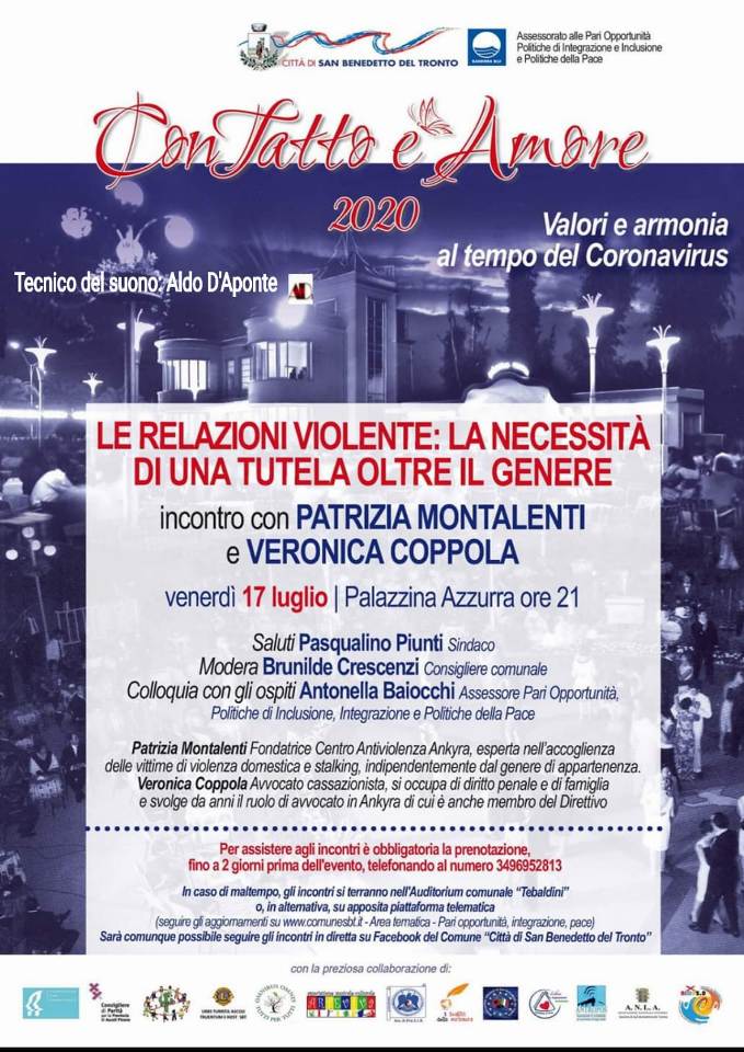 SAN BENEDETTO DEL TRONTO – Venerdì 17 luglio alle ore 21:00 presso la Palazzina Azzurra di San Benedetto del Tronto si terrà l’incontro “Contatto è amore”, le relazioni violente: la necessità di una tutela oltre il genere. Interverranno il sindaco di San Benedetto del Tronto Piunti, il consigliere comunale Crescenzi e l’assessore Pari Opportunità Baiocchi. Il relatori saranno Patrizia Montalenti e Veronica Coppola, che tratteranno il delicato tema della violenza domestica. La violenza domestica ferisce chiunque: donne, uomini e bambini, la società civile è chiamata a tutelare ogni vittima a prescindere dal genere e dall’orientamento sessuale. Patrizia Montalenti è la fondatrice del Centro Antiviolenza Ankyra, esperta nell’accoglienza delle vittime della violenza domestica e stalking, indipendentemente dal genere di appartenenza. Veronica Coppola avvocato cassazionista, si occupa di diritto penale e di famiglia e svolge da anni il ruolo di avvocato di Ankyra di cui è anche membro del Direttivo. Si parlerà della necessità di una tutela non discriminante. Per assistere al convegno è obbligatoria la prenotazione al numero 349/6952813. Obbligatorio l’uso della mascherina e il distanziamento sociale. La prenotazione deve essere effettuata entro due giorni dall’evento, al quale occorre arrivare alle ore 20:30. Al momento della prenotazione è necessario indicare il nome, il cognome e il numero di cellulare. Specificare, se la prenotazione non è di una singola persona, se si è congiunti. In caso di pioggia la conferenza sarà sulla piattaforma Zoom: https://us02web.zoom.us/j/86354538393