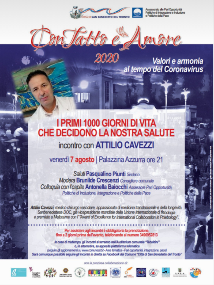 SAN BENEDETTO DEL TRONTO – Venerdì 7 agosto presso la Palazzina Azzurra di San Benedetto del Tronto si svolgerà un altro incontro del ciclo “ConTatto è amore”, questo convegno sarà tenuto da Attilio Cavezzi, medico chirurgo vascolare sambenedettese, già vice presidente mondiale della Unione Internazionale di flebologia e premiato a Melbourne con l’Award of Excellence for International Collaboration in Phlebology. Interverranno il sindaco di San Benedetto del Tronto Piunti, l’Assessore Pari Opportunità Baiocchi e il Consigliere Comunale Crescenzi.