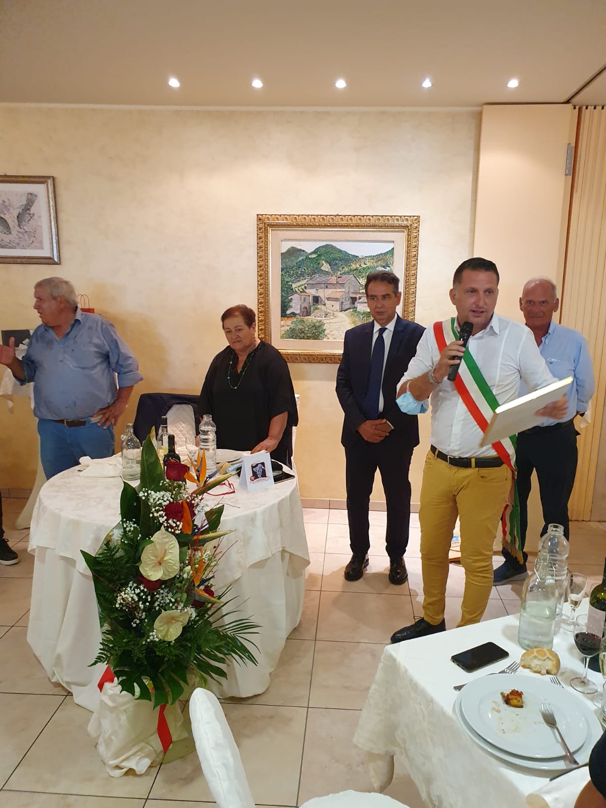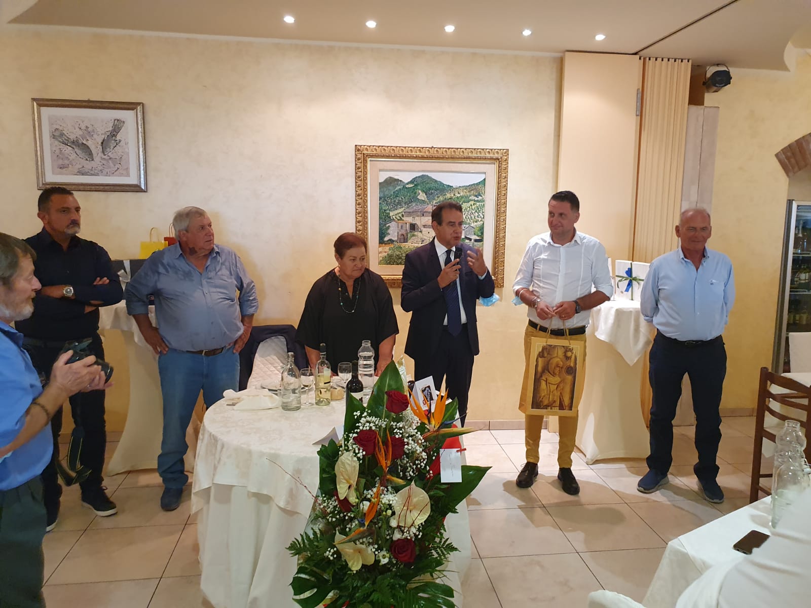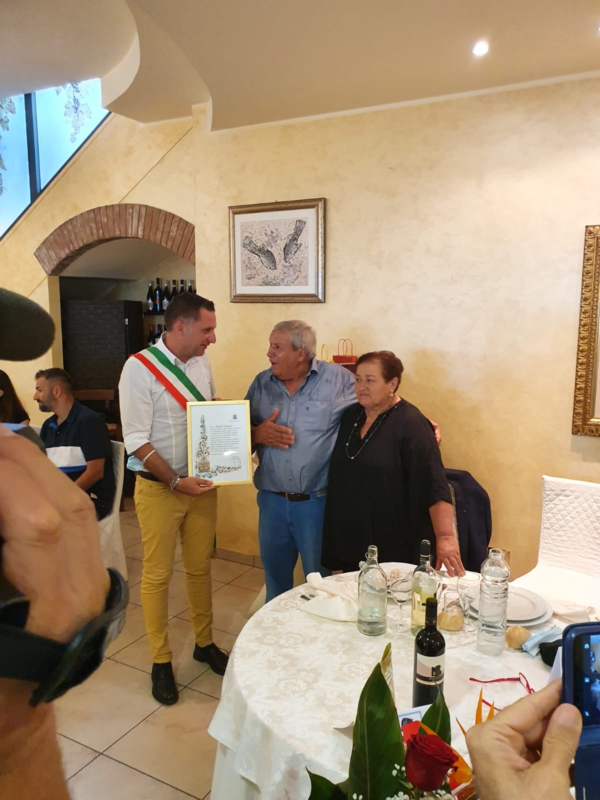 Durante il banchetto in cui Franco e Francesca hanno festeggiato anche i loro 46 anni di matrimonio, non potevano mancare i momenti istituzionali in cui il Comandante della locale stazione dei Carabinieri, il luogotenente maresciallo Gabriele Luciani che si è congratulato con il neo cavaliere donandigli il gress dell’Arma dei Carabinieri.