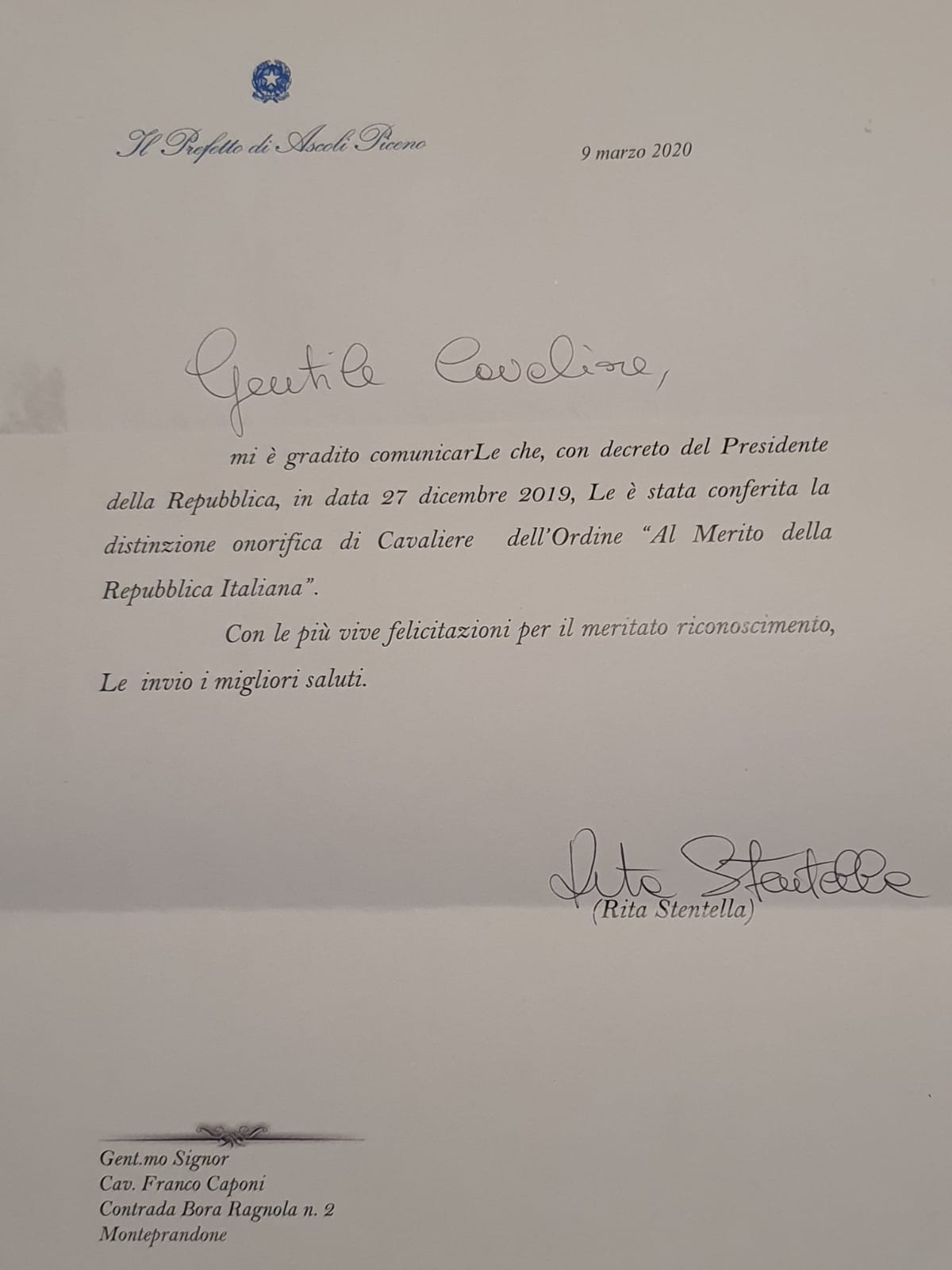 MONTEPRANDONE – Quando alcuni mesi or sono si diffuse in modo ufficioso che il Sig. Franco Caponi, titolare di una delle maggiori aziende agricole di Monteprandone, era stato insignito dell’ onorificenza di Cavaliere dell ordine “Al merito della Repubblica Italiana” suscitò sinceri sentimenti di ammirazione e di stima. Del resto non poteva essere altrimenti. Tutti iN in paese e non solo sanno quanto Franco sia dedito, con passione, competenza e infinito spirito di abnegazione, al lavoro dei suoi campi e alla cura certosina della sue colture che accudisce giorno dopo giorno. Un esempio per tutti di come il lavoro sia il mezzo per esprimere il meglio di sé per produrre il meglio del meglio a beneficio di tutti.