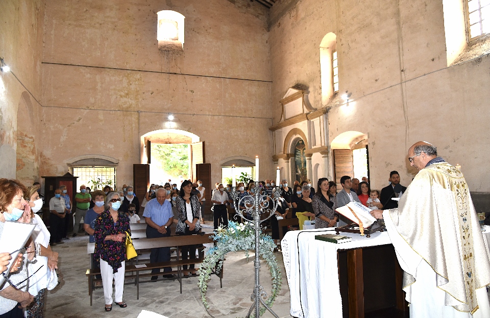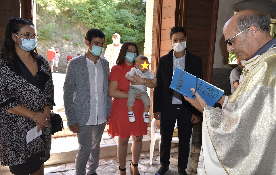 Una bellissima sorpresa, però, attendeva in Chiesa tutti i fedeli: durante la cerimonia religiosa sarebbe stato battezzato il piccolo Daniel qui condotto dai genitori Irene e Gianluca, dai nonni, dal bisnonno, dagli zii e parenti!!!  Dopo una coinvolgente celebrazione, alla quale partecipava ottimamente, con i suoi canti, la Corale “Gregorio Petrocchini”, non poteva mancare, all’uscita e vista l’ora, il solito buonissimo pranzo a base di pesce fritto (e non solo) che è stato gustato da tutti, nei vicini prati, nei tavoli o portato nelle proprie case in grande disciplina, tranquillità e sicurezza!