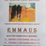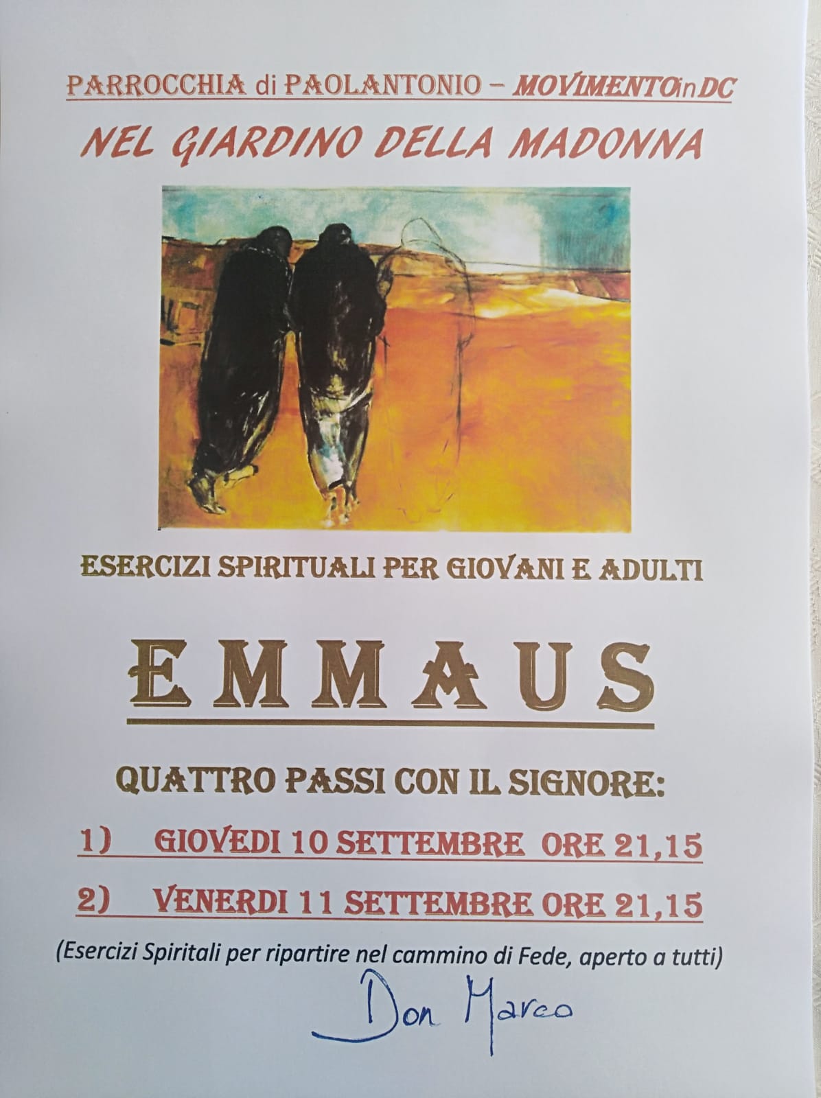 Don Marco Di Giosia, parrocco della parrocchia San Giuseppe di Paolantonio, presenta così questo doppio appuntamento: “Dopo l’esperienza dei 10 Comandamenti e dei 7 Segni, riprendono presso la Parrocchia di Paolantonio gli Esercizi spirituali di inizio anno pastorale. Sono 2 incontri su EMMAUS, 4 PASSI CON IL SIGNORE. “Che cosa è accaduto?“ chiese il Signore. La ripartenza nel cammino di Fede parte dal nostro “Accaduto”, dalla storia, dalle circostanze. Il cristianesimo é vivere intensamente il reale”.