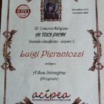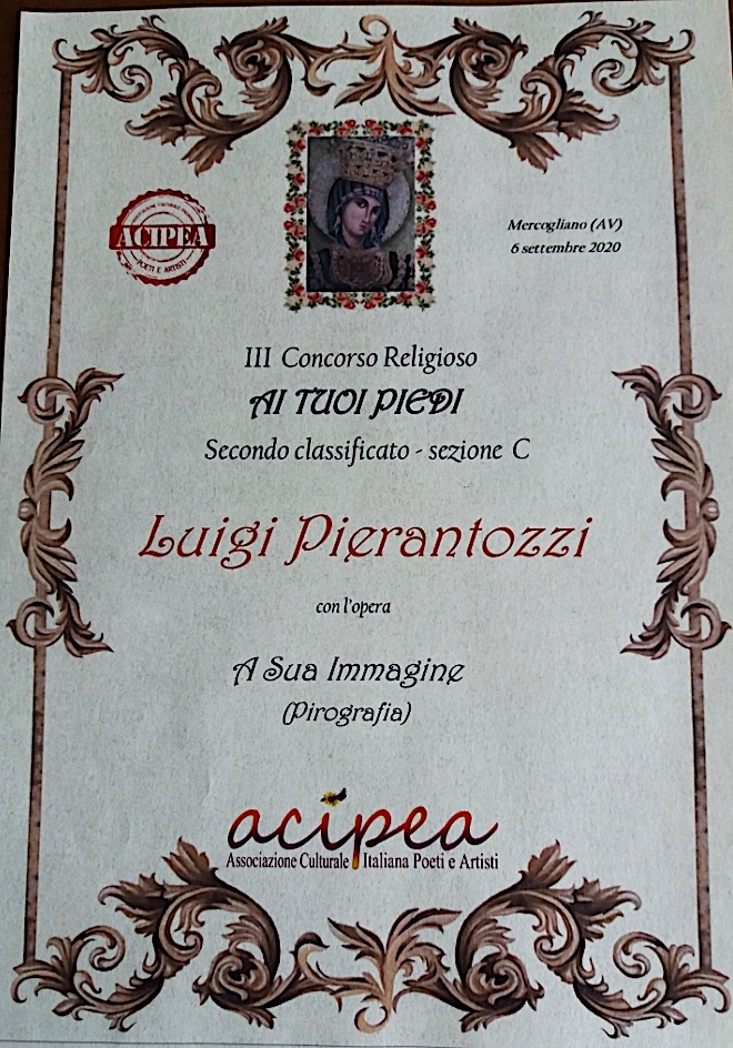 Domenica 6 settembre 2020, nel Santuario della “Madonna di Montevergine” di Mercogliano (Av), il nostro Luigi Pierantozzi ha ricevuto l’ennesimo riconoscimento per la sua arte: gli è stato assegnato, dall’Associazione Culturale Italiana Poeti e Artisti “ACIPEA”, il premio per la sezione C del III Concorso Religioso “AI TUOI PIEDI” con l’opera “A SUA IMMAGINE” (pirografia).