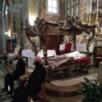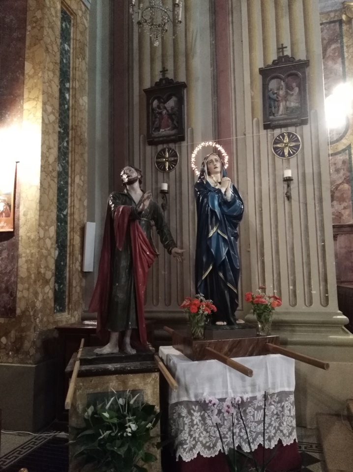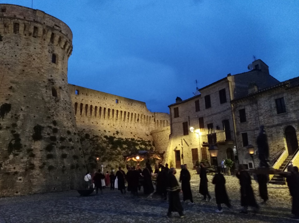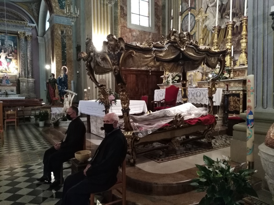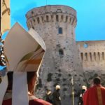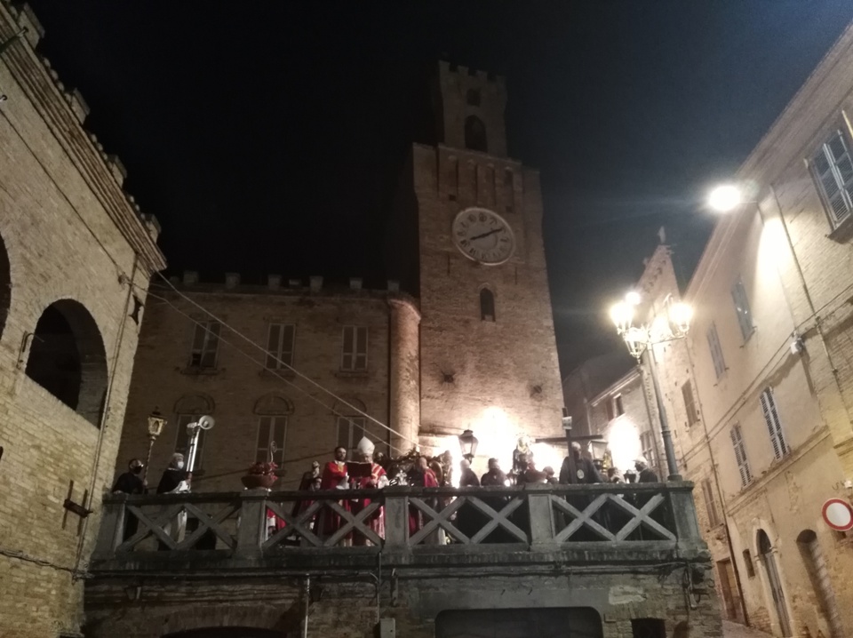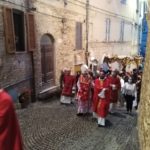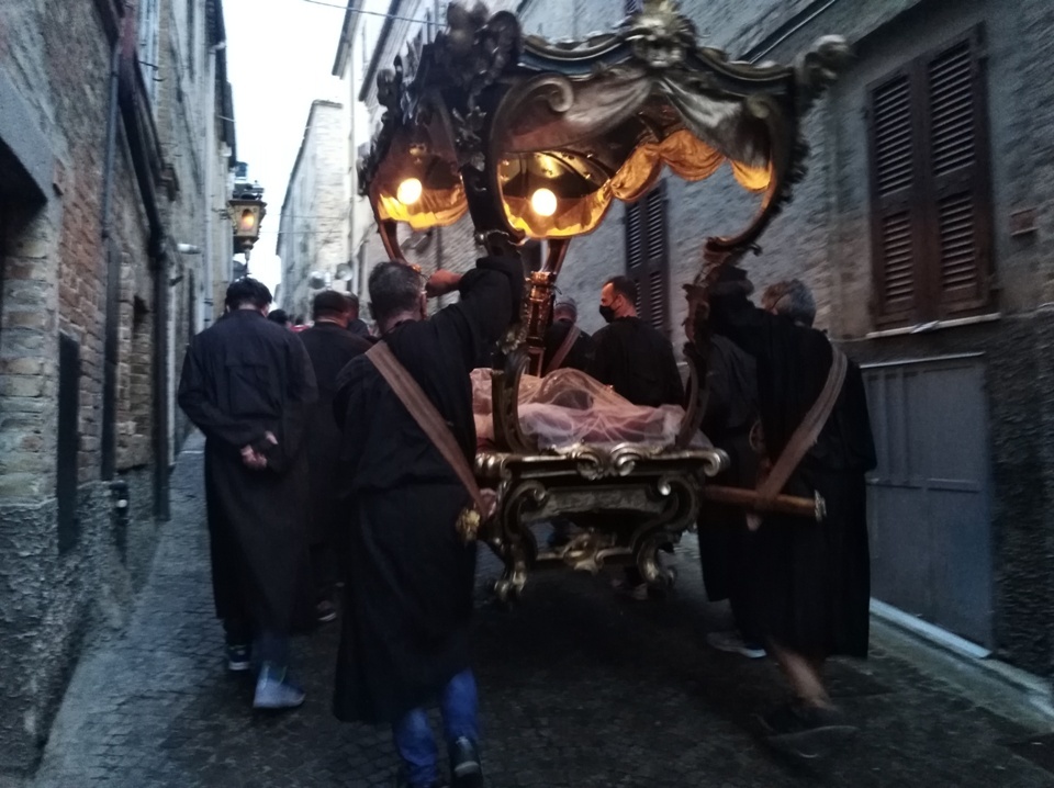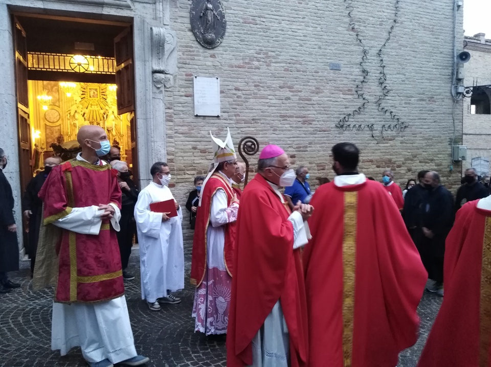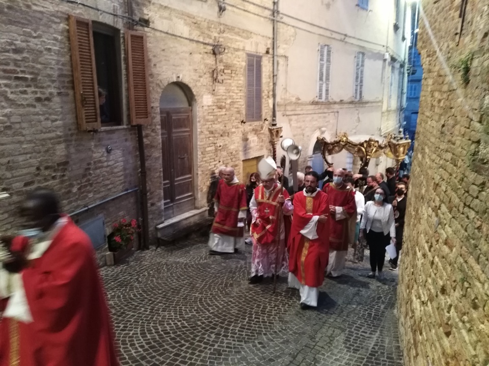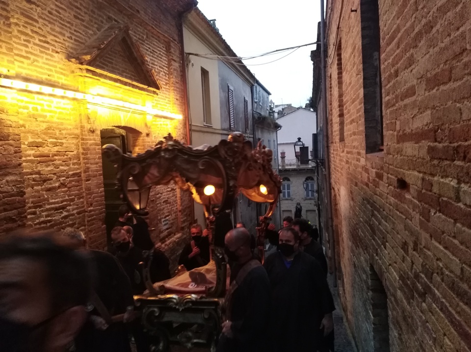 ACQUAVIVA PICENA – Ad Acquaviva Picena domenica 20 settembre, si è snodata per le vie del paese la tradizionale processione in onore della Madonna Addolorata, quest’anno nello stesso giorno in via straordinaria si è svolta anche la processione del Cristo Morto. La Congregazione per il Culto Divino ha dato la facoltà di poter svolgere la processione del Cristo Morto insieme a quella dell’Addolorata perché non si è potuta svolgere come da tradizione il Venerdì Santo, per via della pandemia Coronavirus. A presiedere la santa Messa è stato invitato il vescovo della diocesi di San Benedetto del Tronto – Ripatransone – Montalto delle Marche, Sua Eccellenza Monsignor Carlo Bresciani, che ha poi accettato anche l’invito ad unirsi nella processione. La santa Messa è stata concelebrata dal vescovo emerito della diocesi Sua Eccellenza Monsignor Gervasio Gestori, dal parroco don Pierluigi, da padre Emil del convento degli Agostiniani di Acquaviva, con l’assistenza dei diaconi Walter Gandolfi e Giovanni Bettoni.