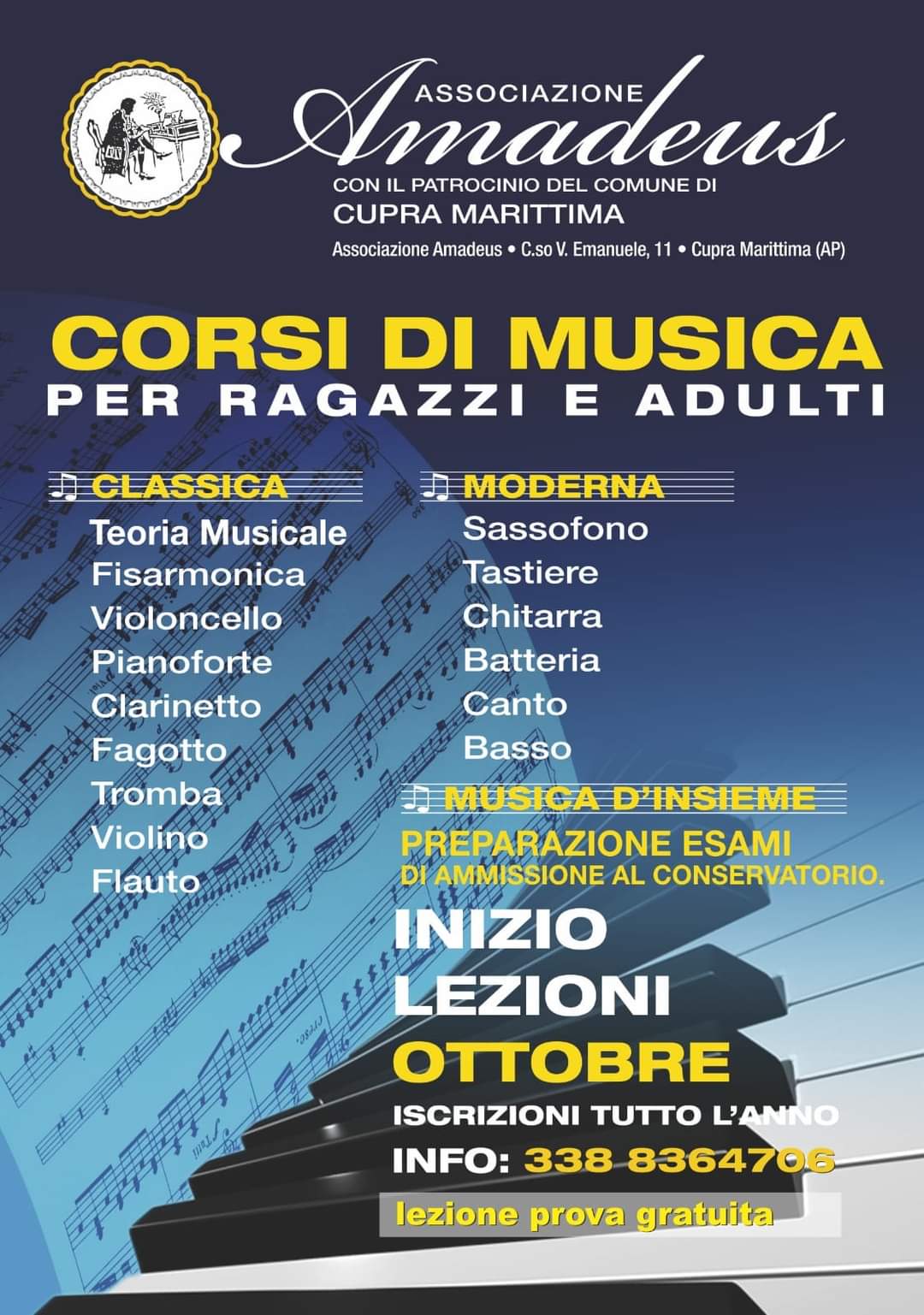 Con l’avvio del nuovo anno scolastico il presidente dell ‘Amadeus Amadio Lara riaprirà i corsi musicali con una grande novità: una nuova sede rinnovata e più confortevole con locali insonorizzati dove far musica sarà un piacere. I corsi offrono la possibilità di studiare e approfondire diversi strumenti: dal violino al pianoforte, dalla chitarra alla batteria, dal sax al clarinetto e da quest’anno anche un corso di pianoforte moderno. Per una formazione musicale completa, volta a soddisfare le esigenze più diverse, l’associazione “Amadeus” mette a disposizione docenti preparati anche nel campo dello studio e dell’impostazione della voce e una lezione gratuita organizzando giorni e orari in accordo con gli iscritti. Oltre alla musica d’insieme, per suonare e divertirsi come in una vera band, la novità del nuovo anno scolastico consisterà nel corso di composizione per cimentarsi a scrivere musica . L’amore per Bach e Beethoven non conosce tempo. Può nascere durante l’infanzia, ma anche a cinquant’anni, infatti per scoprire il fascino delle loro composizioni non esiste limite di età. Per questo l’associazione musicale “Amadeus” apre i corsi a tutti, presso la sua nuova sede di Cupra Marittima in corso Vittorio Emanuele N°47 con uno staff di docenti professionisti, che seguiranno scrupolosamente tutte le novità sulla didattica e la gestione degli spazi secondo i nuovi protocolli di sicurezza previsti dai DPCM.