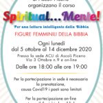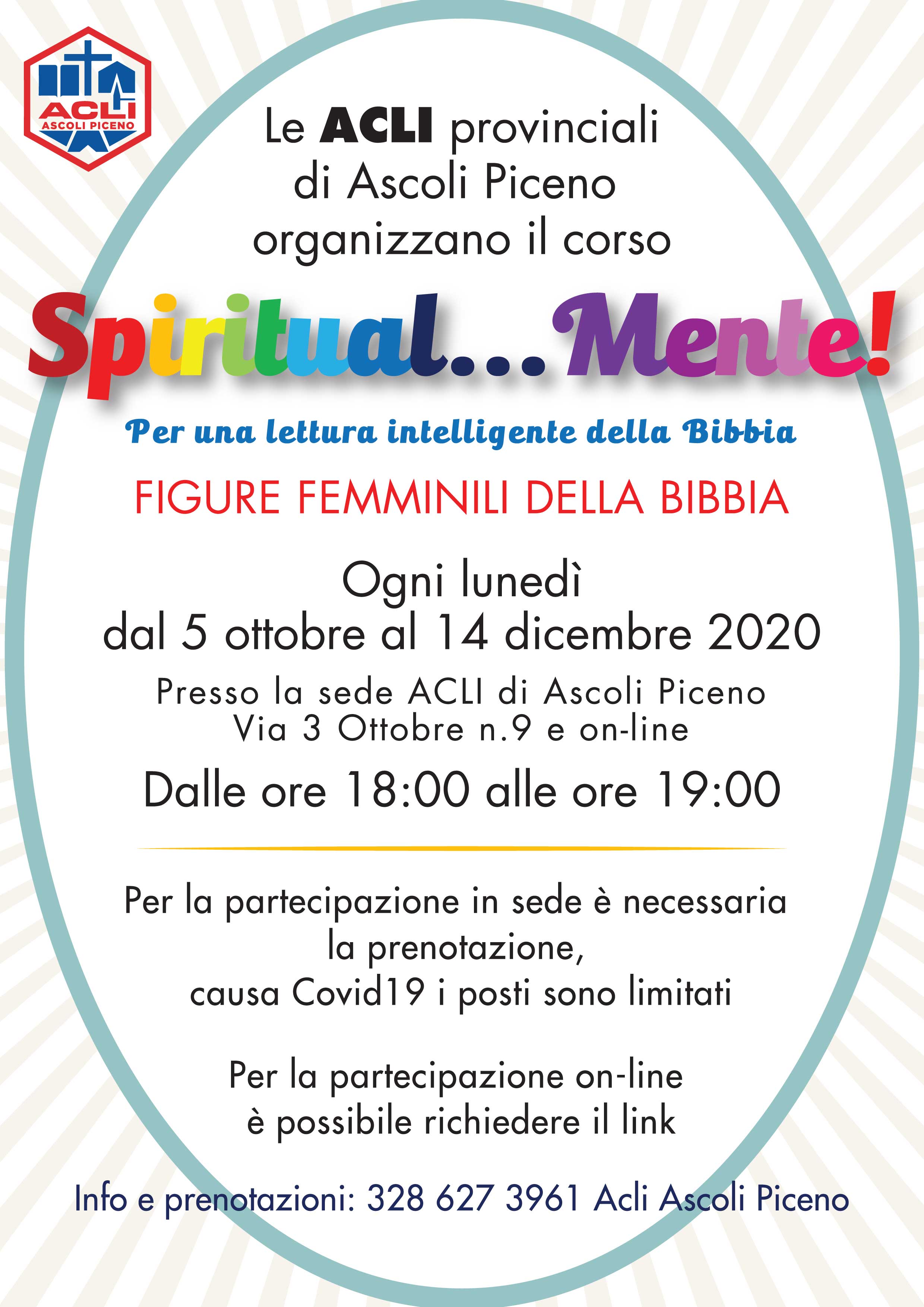 Ascoli Piceno – Dal prossimo 5 ottobre dalle ore 18 alle ore 19, per undici lunedì, presso la sede delle Acli di Ascoli Piceno, in Via III Ottobre, 9, riprendono gli incontri di riflessione teologica a partire dal testo biblico dal titolo “Spiritual…Mente! Per una lettura intelligente della Bibbia”.