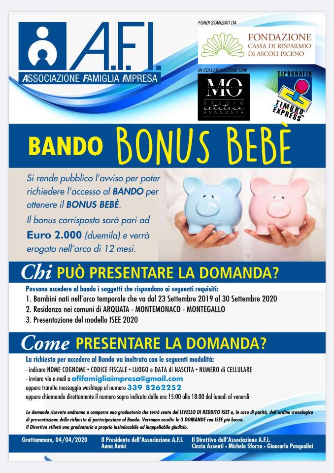 GROTTAMMARE – Il presidente dell’Associazione A.F.I. ( Associazione Famiglia Impresa), Anna Amici, ha reso noto il bando “Bonus bebè”, previsto per i residenti di alcuni paesi terremotati dell’interno del Piceno.