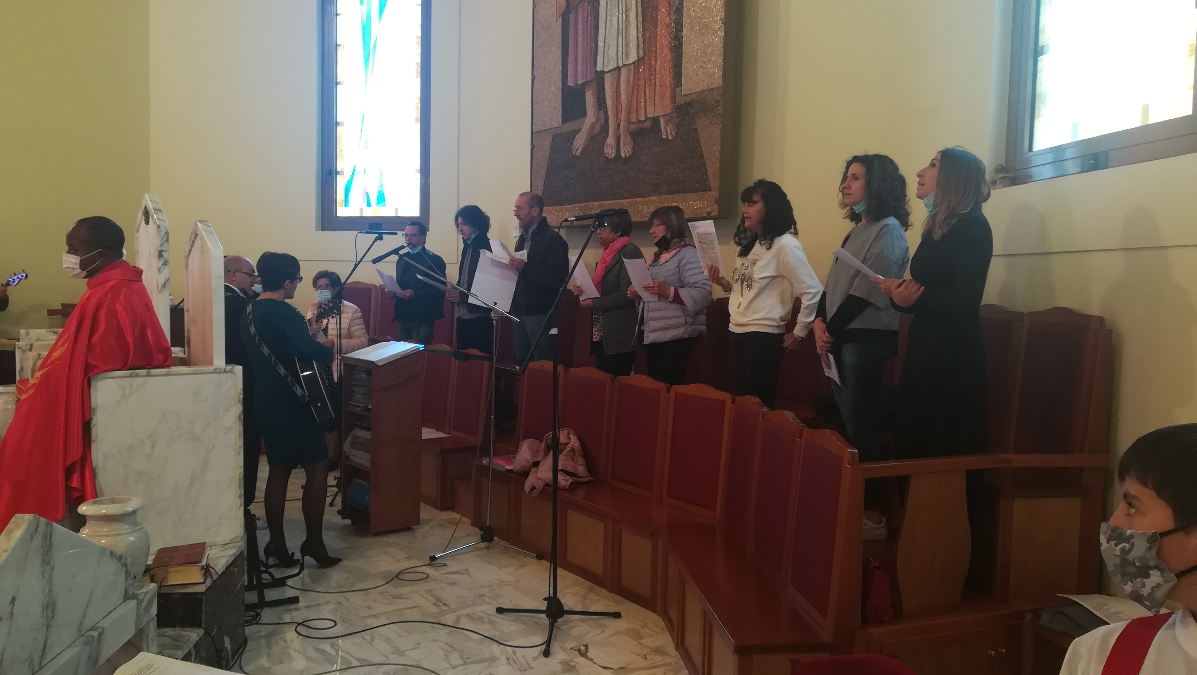 Per ovviare alla ridotta capienza della chiesa, familiari ed amici hanno potuto seguire la celebrazione nel cortile della parrocchia, dove l’audio è stato amplificato e sono state sistemate delle sedie, opportunamente distanziate.