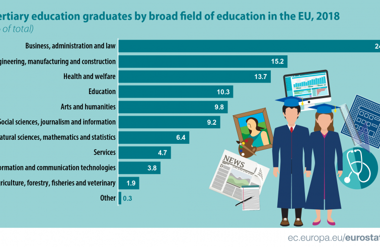A laurearsi nell’Unione europea sono stati circa 4 milioni di giovani nel 2018, per il 57,7% donne. Economia e commercio e giurisprudenza le facoltà più gettonate (24,6%); a seguire le materie ingegneristiche (15,2%), quindi il ramo sanitario (13,7%) e al quarto posto percorsi finalizzati all’insegnamento (10,3%), per lo più nelle materie umanistiche. Permane la differenza fra facoltà a predominanza maschile: di quel 15,2% di europei che si è laureato in ingegneria, per il 10,9% sono stati maschi e il 4,3% donne. Anche ai corsi legati alle tecnologie per informazione e comunicazione, scelte in Europa dal 3,8% degli universitari, si sono laureate l’1% di donne. Al contrario, nel settore delle discipline sanitarie o che hanno a che fare con il welfare, il 10,2% dei laureati erano donne e il 3,5% uomini. Prevalgono le donne anche nei settori economici e della giurisprudenza (14,4% contro il 10,2%). A sfornare più lauree sono le università francesi (796mila in un anno), seguite da quelle tedesche (565mila), polacche (470mila) e spagnole (461mila). L’Italia viene subito dopo, con quasi 400mila laureati nel 2018: di questi poco più di 70mila sono usciti dalle facoltà di economia e giurisprudenza, 67mila da quelle umanistiche, 61mila da ingegneria, 58mila dalle facoltà sanitarie e 57mila dalle scienze sociali e settore informazione; 28mila laureti si sono preparati per l’insegnamento.