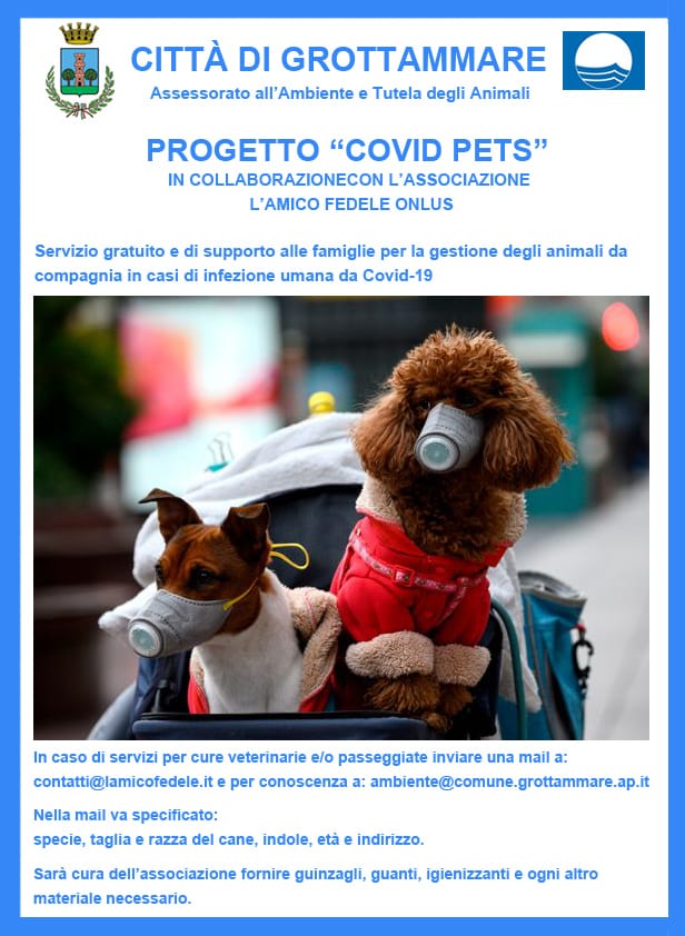 Con il progetto “Covid Pets”, i volontari dell’associazione si mettono a disposizione delle famiglie per l’accudimento degli animali da affezione, relativamente a varie necessità, quotidiane e non, come esigenze fisiologiche, passeggiate di svago, cure medicoveterinarie, ecc.