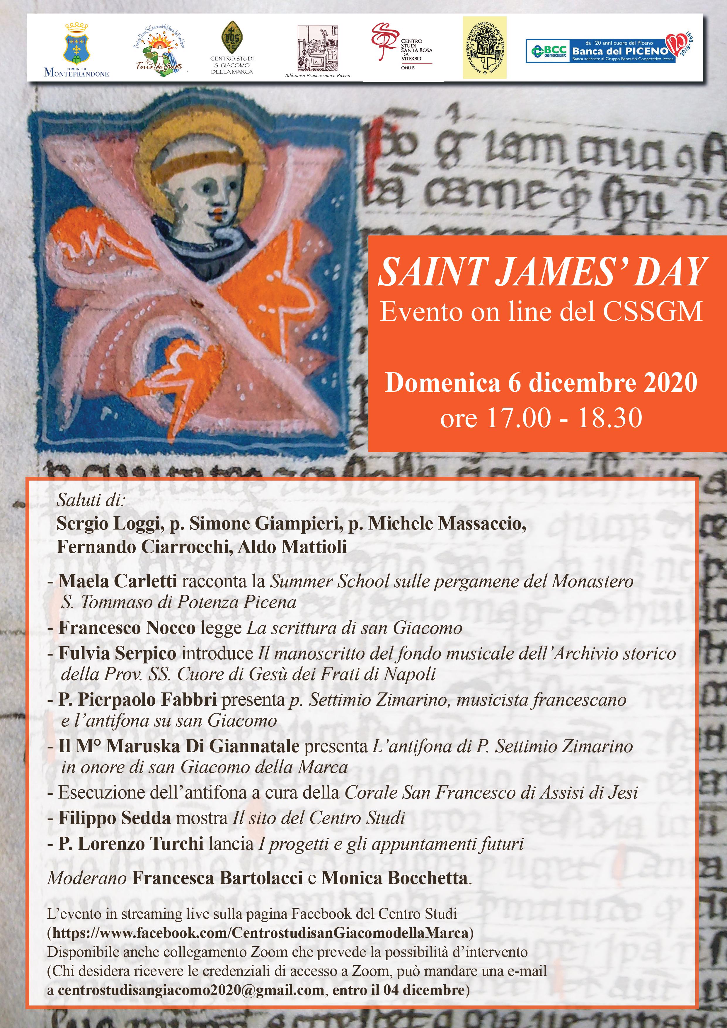Il Centro Studi San Giacomo della Marca, in collaborazione con la Provincia Picena San Giacomo della Marca dei Frati Minori, la Biblioteca Francescana e Picena, il Centro Studi Santa Rosa da Viterbo onlus, il Comune di Monteprandone e la Banca del Piceno BCC Credito Cooperativo, ha organizzato un incontro online dal titolo “Saint James’day”. Oggi, domenica 6 dicembre, a partire dalle 17, partirà lo streaming live sulla pagina Facebook del Centro Studi www.facebook.com/CentrostudisanGiacomodellaMarca.