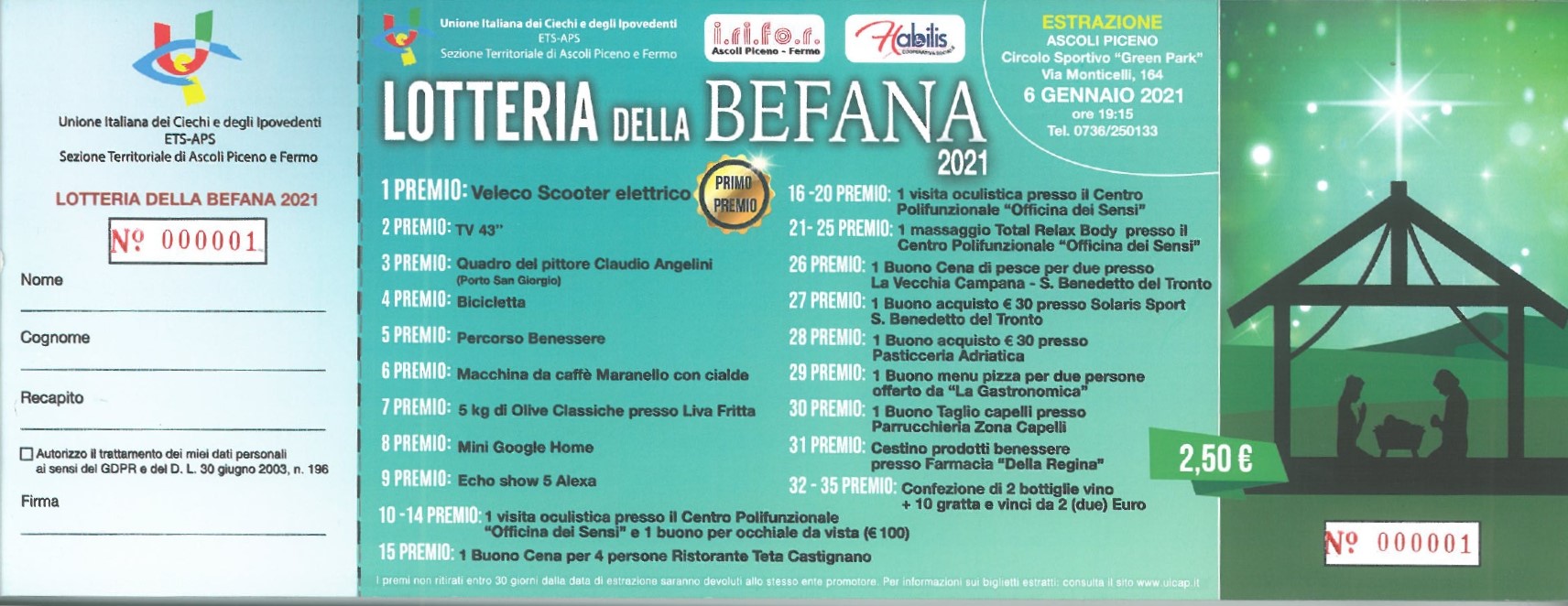 ASCOLI PICENO – Uno Scooter elettrico, una Tv da 43 pollici, un quadro del pittore Claudio Angelini e poi biciclette, percorsi benessere, macchine da caffè e numerosi buoni per visite oculistiche, servizi dal parrucchiere e ristoranti. La storica Lotteria della Befana dell’Unione Ciechi e Ipovedenti di Ascoli Piceno e Fermo non si fa intimorire dal Covid e propone una edizione 2020 che fa volare sul web desideri e progetti. “Sì, perché con i fondi che riusciremo a raccogliere – spiega la presidente Uici territoriale, Gigliola Chiappini – realizzeremo una cabina di registrazione per libri e musica dedicata ai nostri soci”.