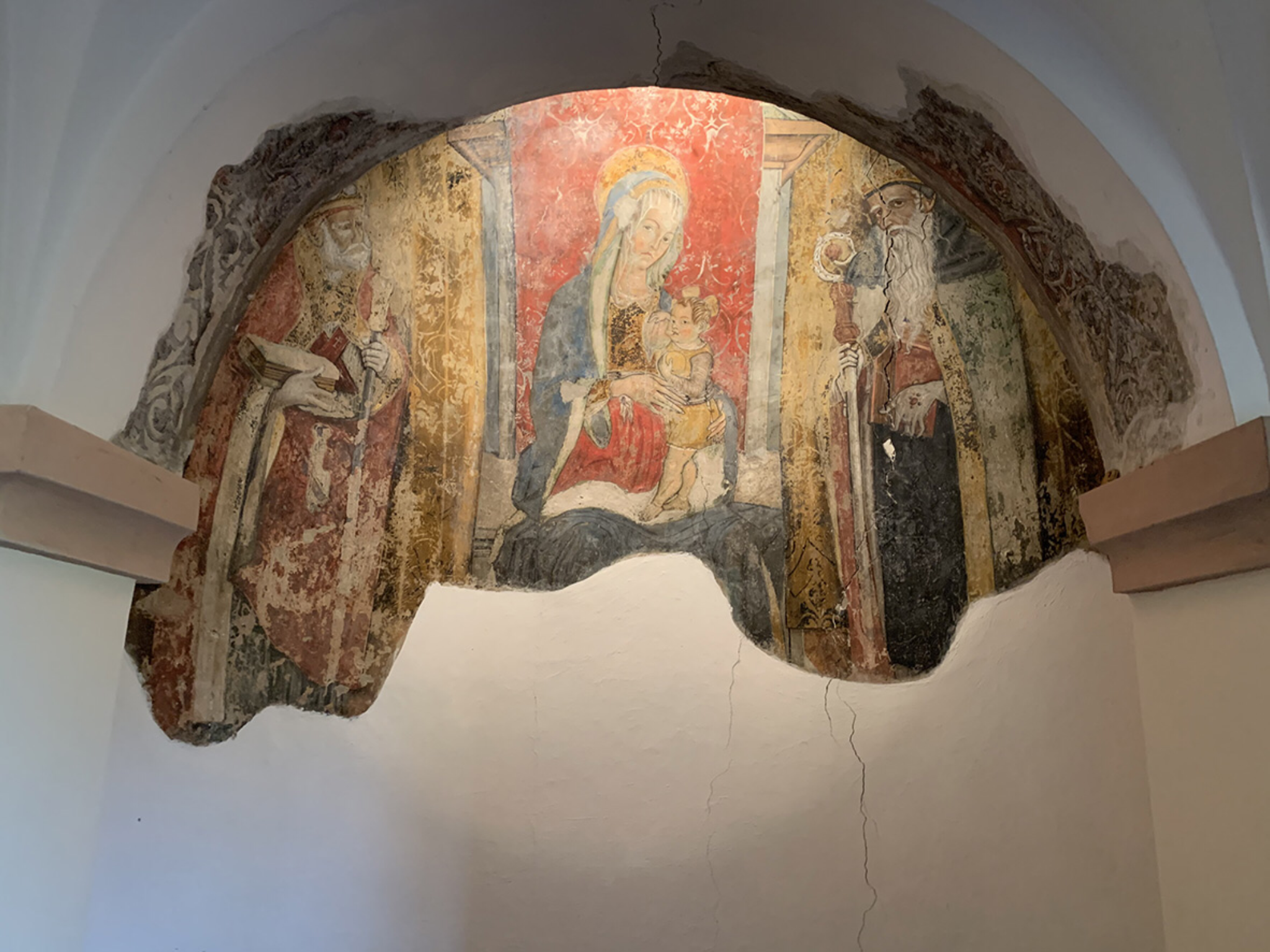 A portare avanti tutto il lavoro è il restauratore Andrea Simoni che spiega: «Lo stile di questo dipinto è quello dell’ambito di Vittore Crivelli o di Pietro Alamanno. Se l’attribuzione è corretta, ci troviamo davanti ad un unicum in quanto né Vittore, né suo fratello Carlo hanno mai realizzato affreschi. Comunque, ci troviamo sicuramente nell’ambito della bottega di questo artista. Con gli eventi sismici del 2016 il dipinto si è lesionato e ha perso anche alcuni frammenti. Fino ad ora siamo intervenuti per mettere in sicurezza l’opera e abbiamo agito per consolidare la struttura al fine di non perdere ulteriori pezzi. Adesso andremo invece a pulire l’immagine che purtroppo è molto sporca, a colpare le lacune per concludere infine col restauro pittorico. Per quanto riguarda la tempistica, i lavori potranno iniziare solo dopo aver avuto l’autorizzazione da parte della Soprintendenza ai Beni Culturali, che credo avverrà fra circa un mese. Una volta avviati i lavori, occorreranno tre mesi per completare l’opera».
