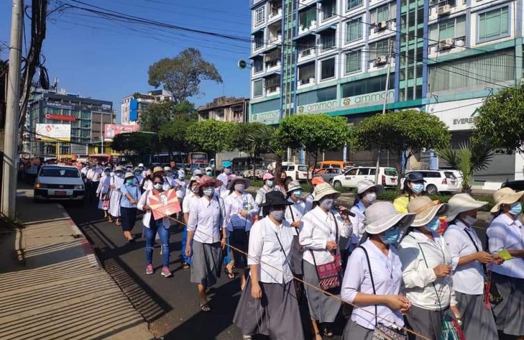 Suore, preti, laici cattolici si sono uniti alle proteste del popolo del Myanmar contro il colpo di stato militare del 1 febbraio. Ieri, a Yangon, centinaia di cattolici, comprese moltissime suore, hanno marciato pacificamente per le strade della città dalla Chiesa di Fatima alla Chiesa di San Francesco recitando preghiere e con il rosario in mano. Stessa cosa è avvenuta nella diocesi di Kengtung l’11 febbraio mentre ieri nella roccaforte cristiana dello Stato di Kachin, le suore stavano all’ingresso di una chiesa con in mano cartelli che recitavano “No alla dittatura” e “Ascolta le voci della gente”, a supporto dei manifestanti che riempivano le strade di Myitkyina, la capitale dello Stato. A scendere per strada sono stati soprattutto i giovani che inneggiavano a “Free Aung San Suu Kyi” e “We support CDM”, in riferimento al movimento di disobbedienza civile.
