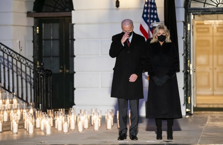 A conclusione del suo discorso, il presidente insieme alla first lady Jill Biden, al vicepresidente Kamala Harris e al marito Doug Emhoff si sono fermati davanti alla Casa Bianca per un momento di silenzio, mentre un drappo nero incorniciava l’ingresso e 500 candele brillavano sulle scale, una per ogni mille persone perse, la banda dei marine suonava l’inno cristiano “Amazing Grace”; e Joe Biden si segnava con la croce, in preghiera per l’America e per gli americani.