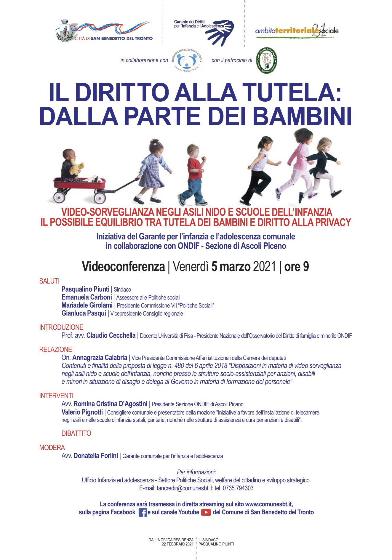 L’incontro, organizzato in collaborazione con l’Assessorato alle politiche sociali del Comune, la Sezione di Ascoli Piceno dell’Osservatorio Nazionale sul Diritto di Famiglia – ONDIF, l’Ambito Territoriale Sociale n. 21 e patrocinato dal Consiglio Regionale delle Marche, sarà trasmesso in diretta streaming sulla pagina Facebook e YouTube del Comune e verterà sulla proposta di legge n. 480/2018 “Disposizioni in materia di video sorveglianza negli asili nido e scuole dell’infanzia, nonché presso le strutture socio-assistenziali per anziani, disabili e minori in situazioni di disagio e delega al Governo in materia di formazione professionale” che ha avuto già un primo passaggio alla Camera dei Deputati. Relatrice dell’evento sarà l’onorevole Annagrazia Calabria, prima firmataria della proposta di legge.