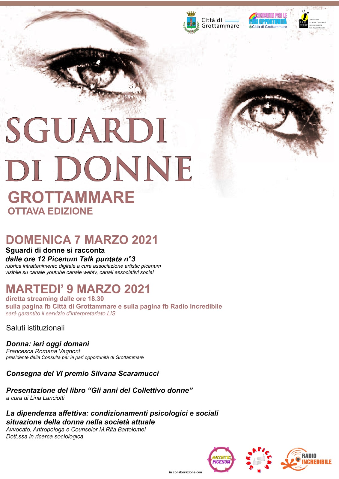 L’evento di martedì prossimo – su Facebook, alle pagine Città di Grottammare o Radio Incredibile – sarà preceduto domenica 7 marzo alle ore 12 da “Sguardi di donne si racconta”, a cura dell’Associazione Artistic Picenum, per la rubrica “Picenum Talk” su Youtube.