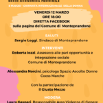 L’evento si terrà venerdì 12 marzo, a partire dalle ore 18, in streaming sulla pagina Facebook del Comune di Monteprandone. Dopo i saluti del sindaco Sergio Loggi, ci saranno gli interventi dell’assessore alle pari opportunità e integrazione Roberta Iozzi e della psicologa Alessandra Norcini dello “Spazio Ascolto Donne” servizio comunale gratuito, che offre ascolto ed accoglienza alle donne in difficoltà tramite consulenza psicologica e legale, gestito dalla cooperativa Cooss Marche.