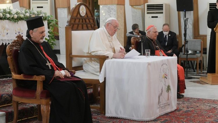 “Benvenuto nella terra di Abramo”: è stato il saluto del cardinale Louis Raphael Sako, Patriarca di Babilonia dei Caldei, che ha ringraziato il Papa per la sua “visita coraggiosa” che incoraggia a consolidare le fraterne relazioni con i musulmani. Ha poi ricordato che i cristiani sono “una minoranza viva” che ha conservato la fede nonostante gli attentati, l’abbandono di 120 mila cristiani dalla piana di Ninive e da Mossul a causa dell’Isis. “Questa vostra visita paterna – ha continuato Sako – ci dà la forza di superare le avversità, ci rassicura che non siamo dimenticati”, spinge a lavorare per “costruire il nostro Paese su regole solide e a stabilire i valori della cittadinanza e della convivenza sulla base di una fraternità rispettosa della diversità e del pluralismo”.